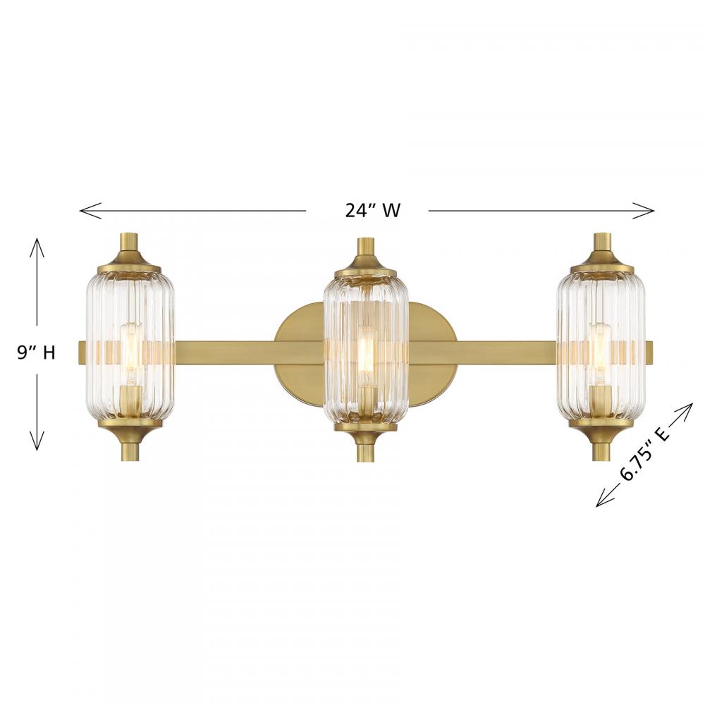 The Savoy House Holton 3-light bath light showcases an inventive and geometric style with tall, rounded shades of clear ribbed glass and a slim, rounded structure finished in Warm Brass. It will bring a big dose of style to any bathroom! Holton is 9" in height, 24" in width and extends 6.75" from the wall. It uses three candelabra size bulbs of up to 60 watts per bulb. Bulbs not included. Install as shown. This bath bar is damp area rated.