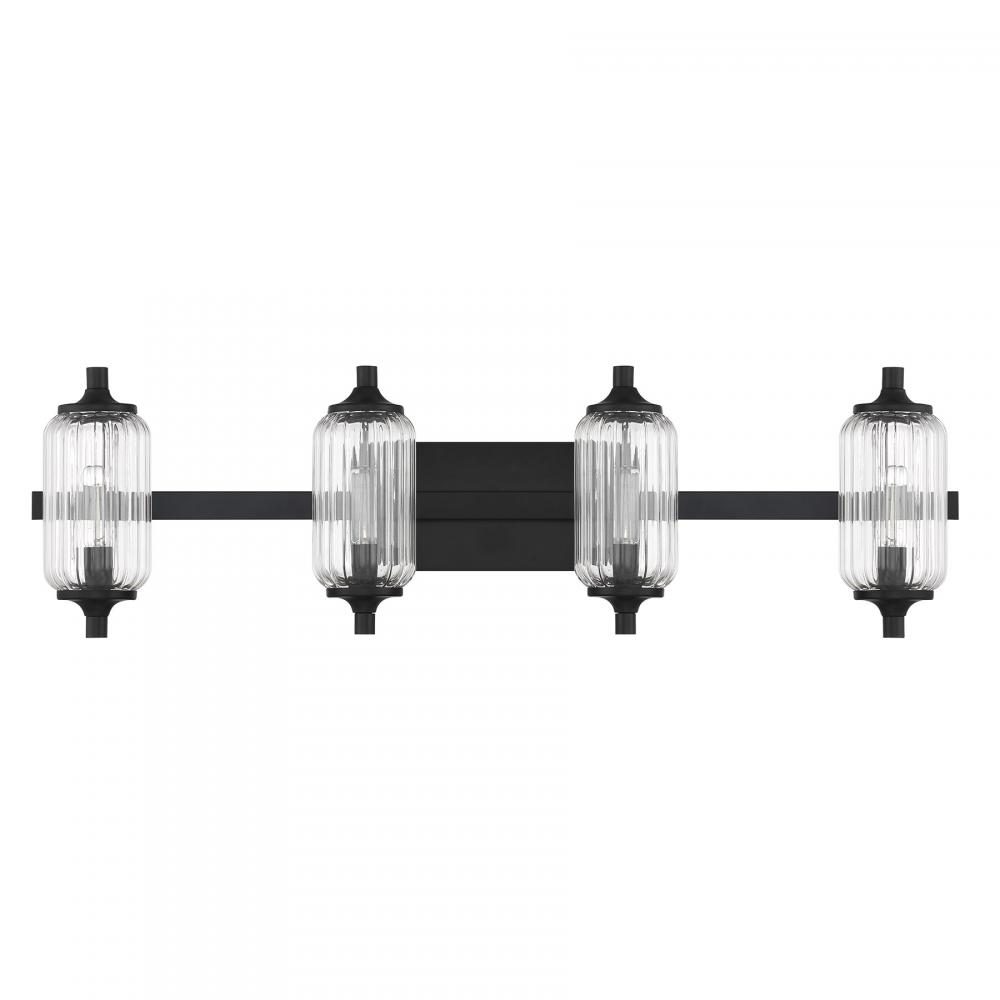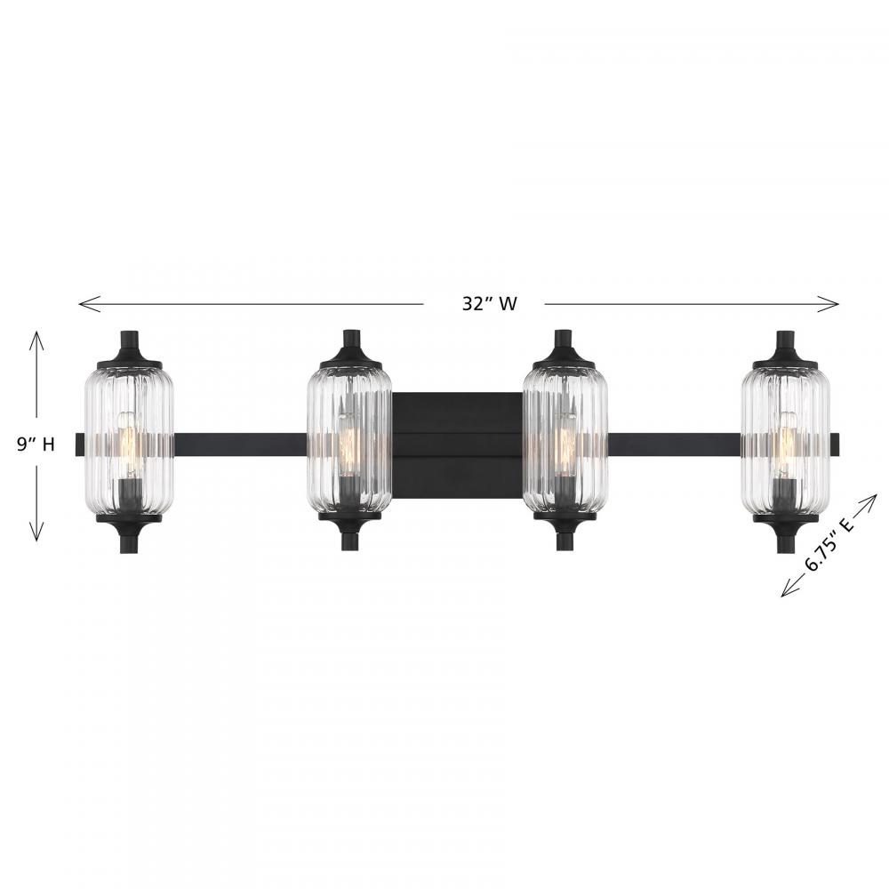 The Savoy House Holton 4-light bath light showcases an inventive and geometric style with tall, rounded shades of clear ribbed glass and a slim, rounded structure finished in Black. It will bring a big dose of style to any bathroom! Holton is 9" in height, 32" in width and extends 6.75" from the wall. It uses four candelabra size bulbs of up to 60 watts per bulb. Bulbs not included. Install as shown. This bath bar is damp area rated.