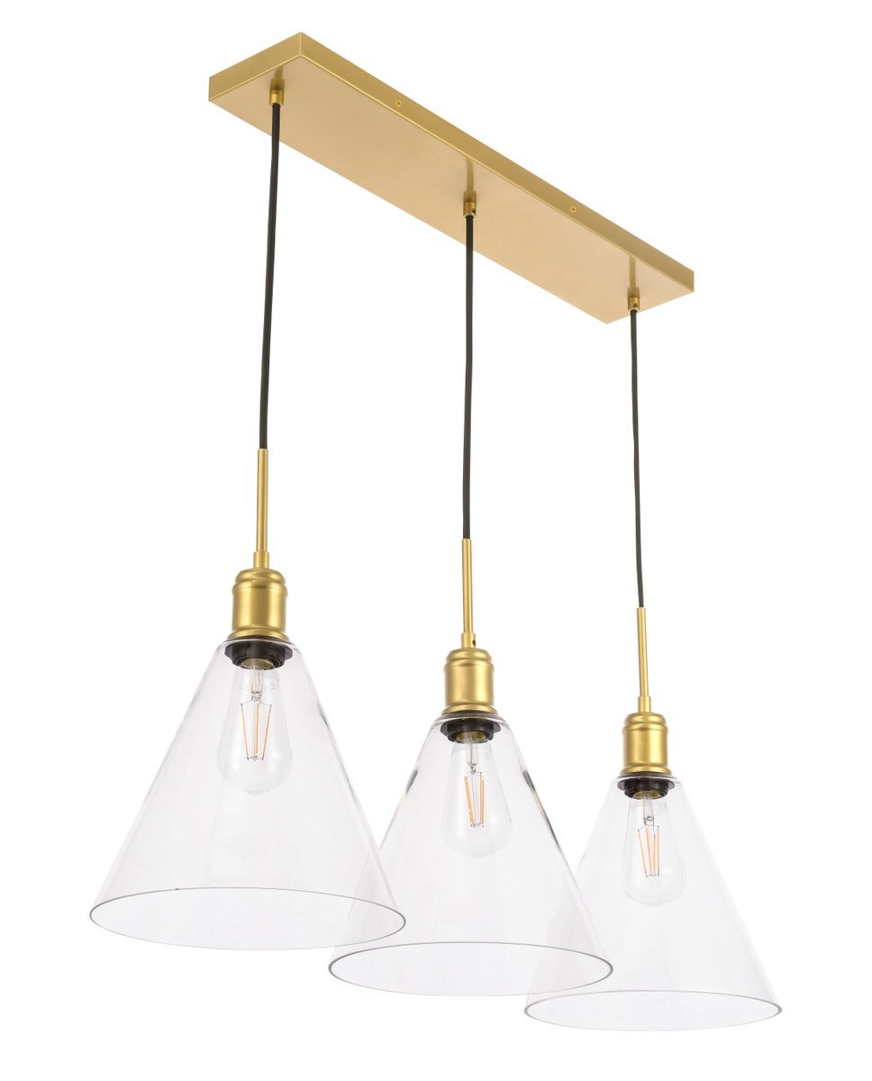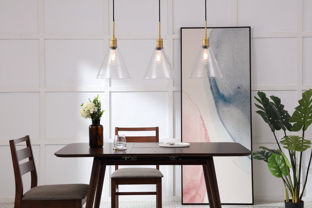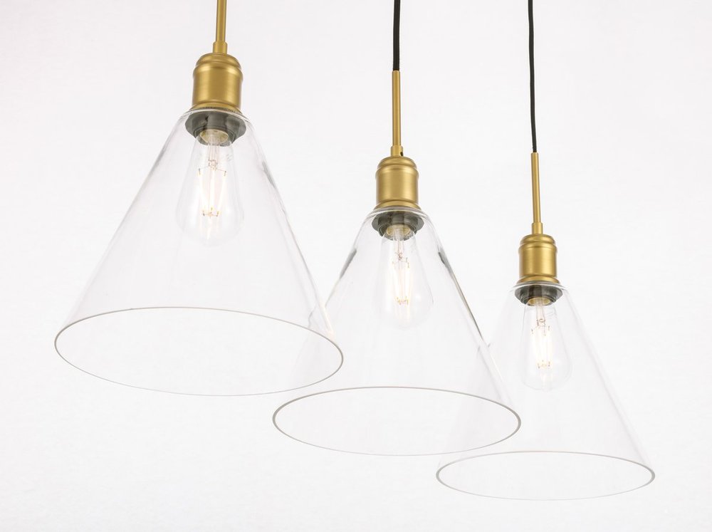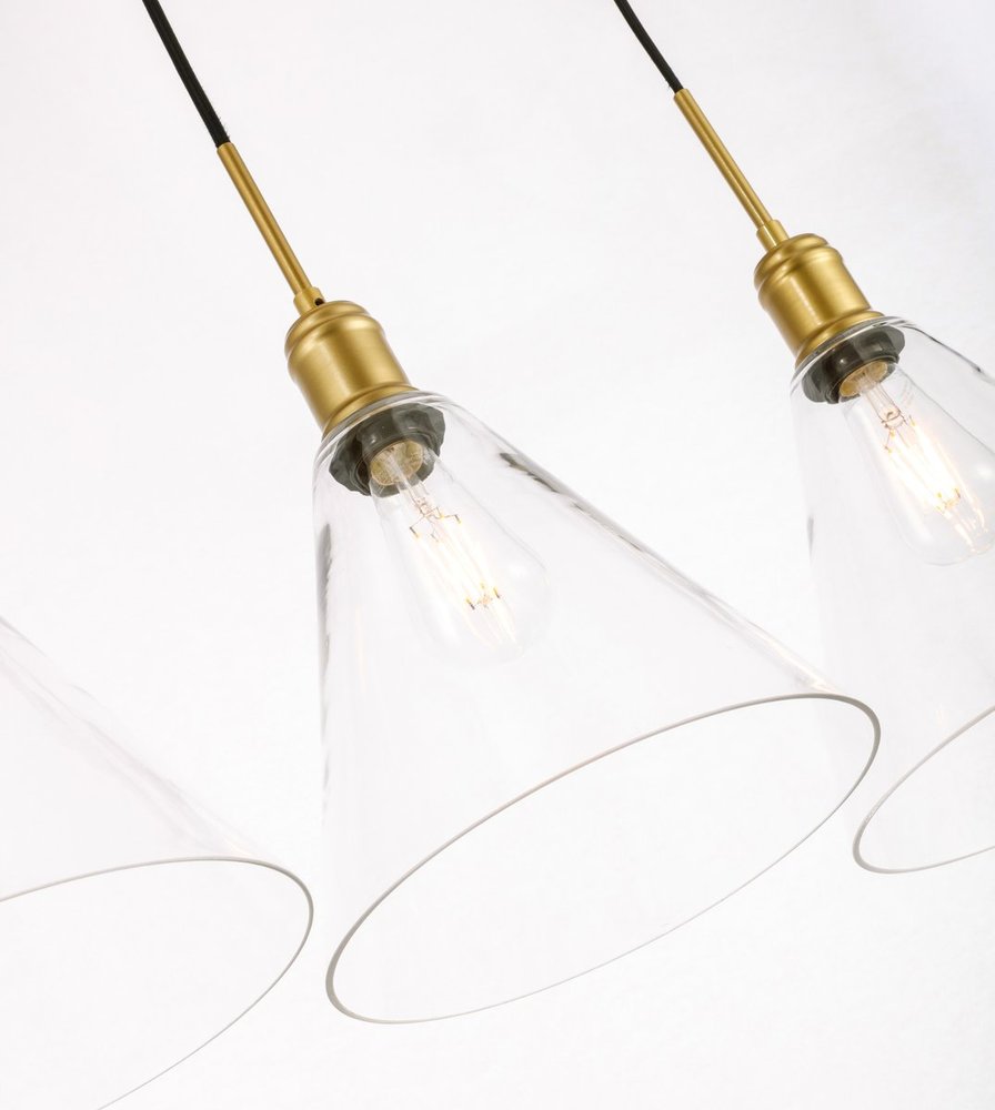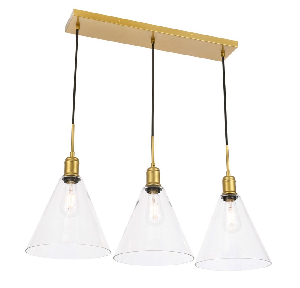 The Hugh Collection of hanging pendant lamps offer clean lines with its three round clear glass shades. Its size makes it the perfect fixture to illuminate small spaces, such as apartments in the city, but it is also bright enough to illuminate any larger spaces as well. Don't be limited to one place because this fixture is versatile with any design and location. Its light and welcoming brightness will surely brighten your day-today life. Available in black, chrome, or brass, enjoy modern day life with this contemporary style (light bulbs not included).