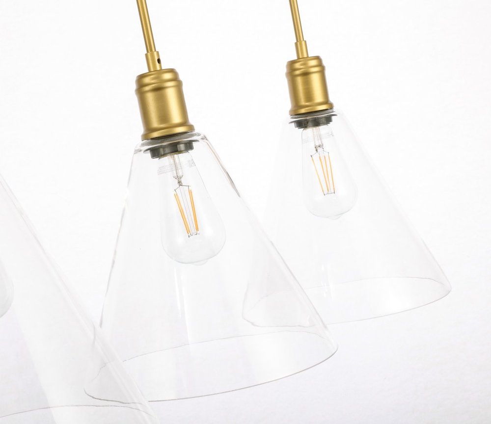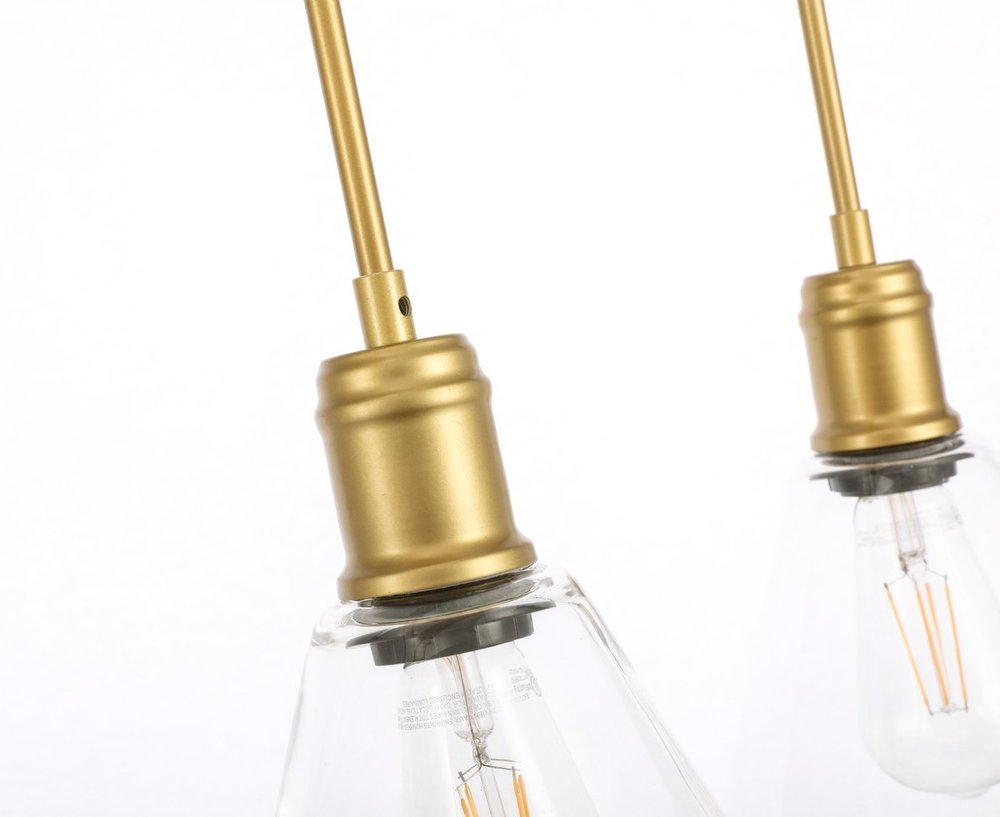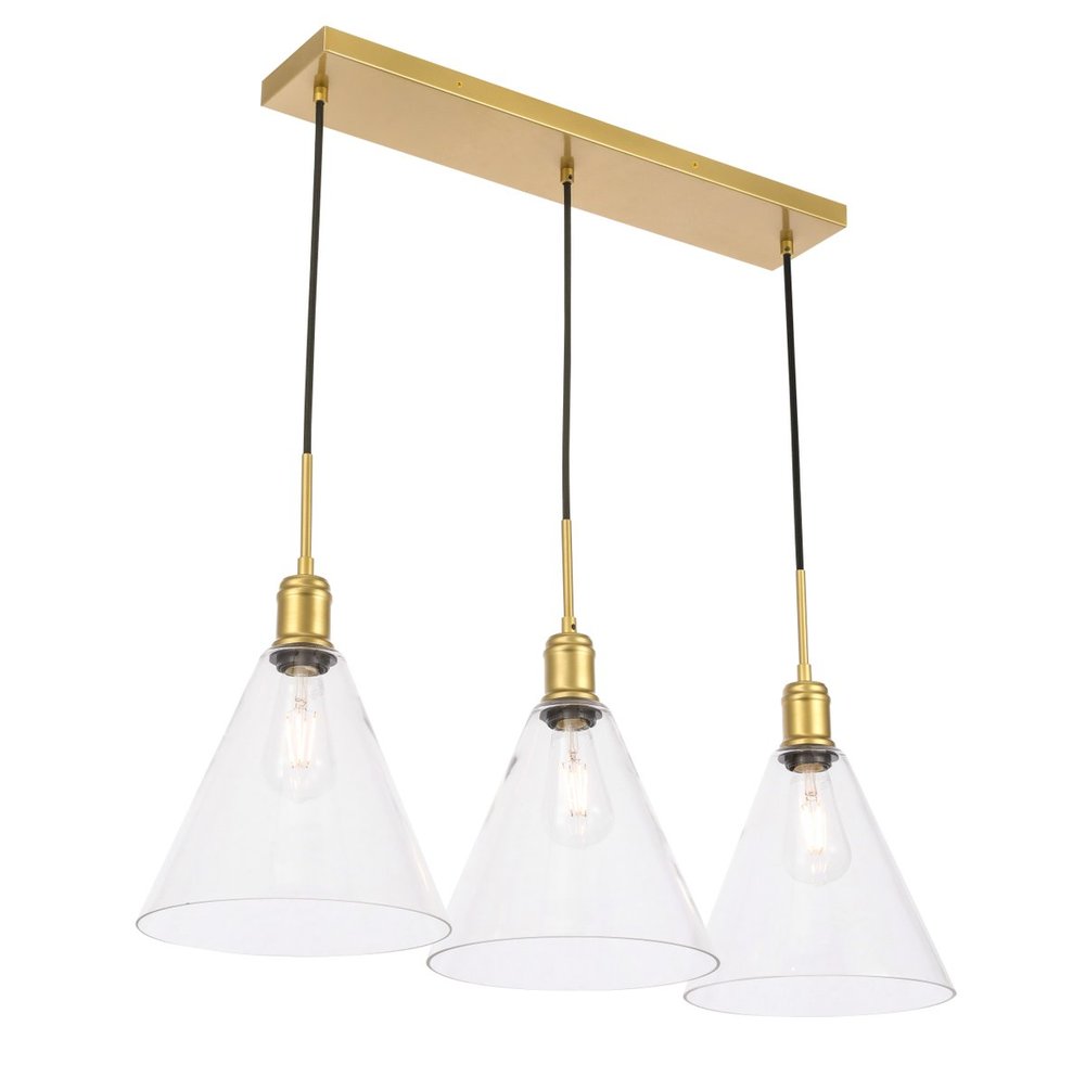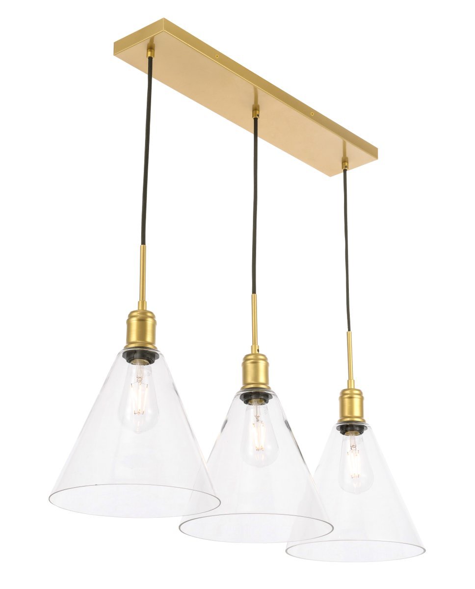 The Hugh Collection of hanging pendant lamps offer clean lines with its three round clear glass shades. Its size makes it the perfect fixture to illuminate small spaces, such as apartments in the city, but it is also bright enough to illuminate any larger spaces as well. Don't be limited to one place because this fixture is versatile with any design and location. Its light and welcoming brightness will surely brighten your day-today life. Available in black, chrome, or brass, enjoy modern day life with this contemporary style (light bulbs not included).
