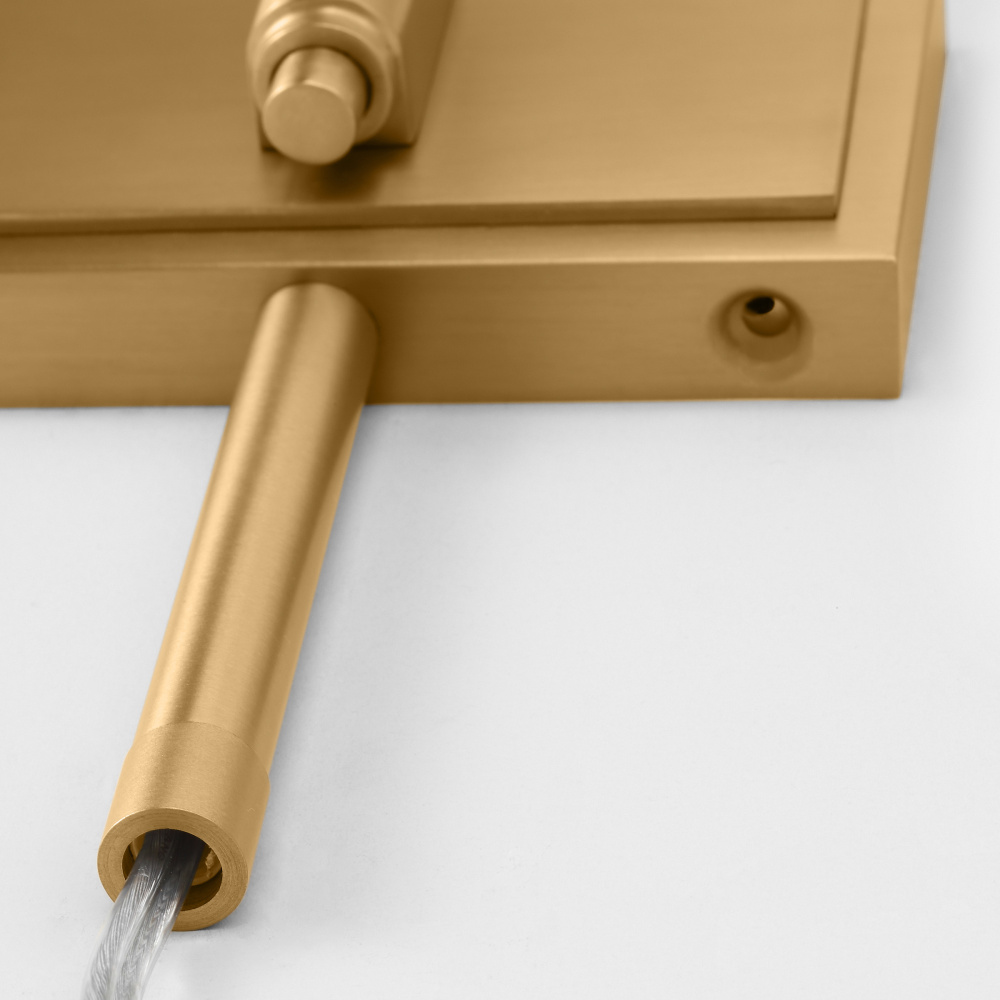 Inspired by a ship's outer hull, the Hull series by Chapman & Myers has a unique shade of these picture lights made from a single piece of metal bent into a cylindrical form. These picture lights have an open-ended design directing light both down and to the sides. A subtle horse saddle design and double barrel back-plate detail that pivots in the direction needed. Available in three sizes and two finish options.