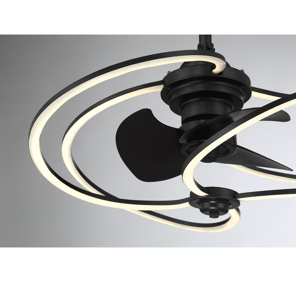 Add a hint of magic to your home with the Savoy House Hydra Fan D'Lier, which blends the chandelier and the ceiling fan into one fabulously fashionable fixture. Its swirling bands of integrated LED light encircle the fan, which is finished in Matte Black. Hydra uses an efficient DC motor and has a handheld remote control for extra convenience. It is 24" in width and 11.5" in height. Comes with a 4" downrod and an 18" downrod. Fan D'Liers are a Savoy House exclusive. These custom designs are inspired by high-end designer styles and take top trends to a whole new level.