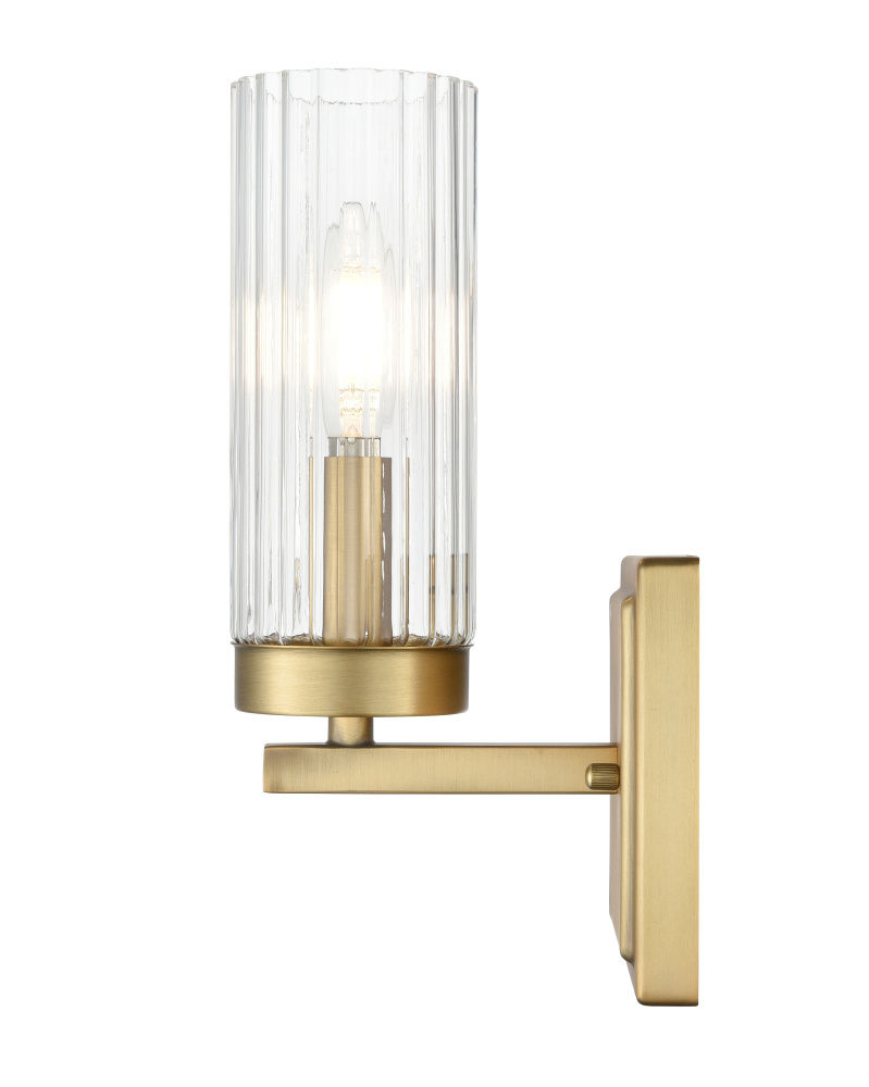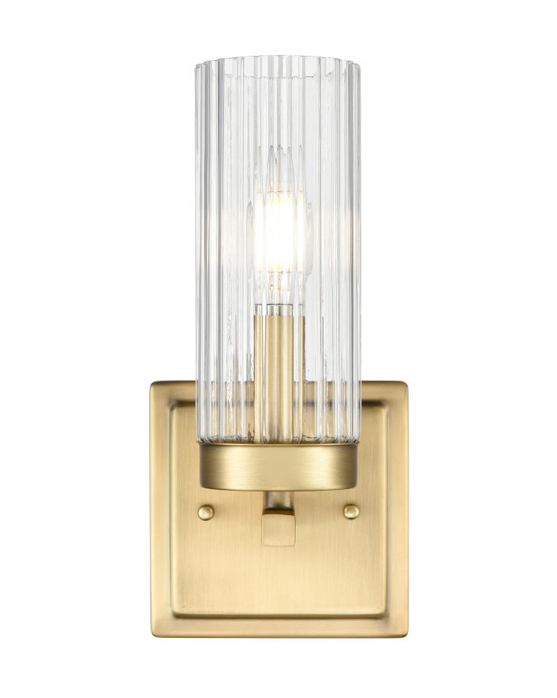 The Iversen Family of vanity and sconce lighting is distinguished by a blend of sleek lines accentuated with post-industrial style hardware. From the square backplate with inset design, to the sparkling clear reeded glass shades, the result is a dazzling play of light perfect for bath or hallway. These exceptional fixtures are available as 1-light sconces and 2-, 3-, or 4-light vanity lamps and are finished in brushed nickel, chrome, matte black, or vintage brass.