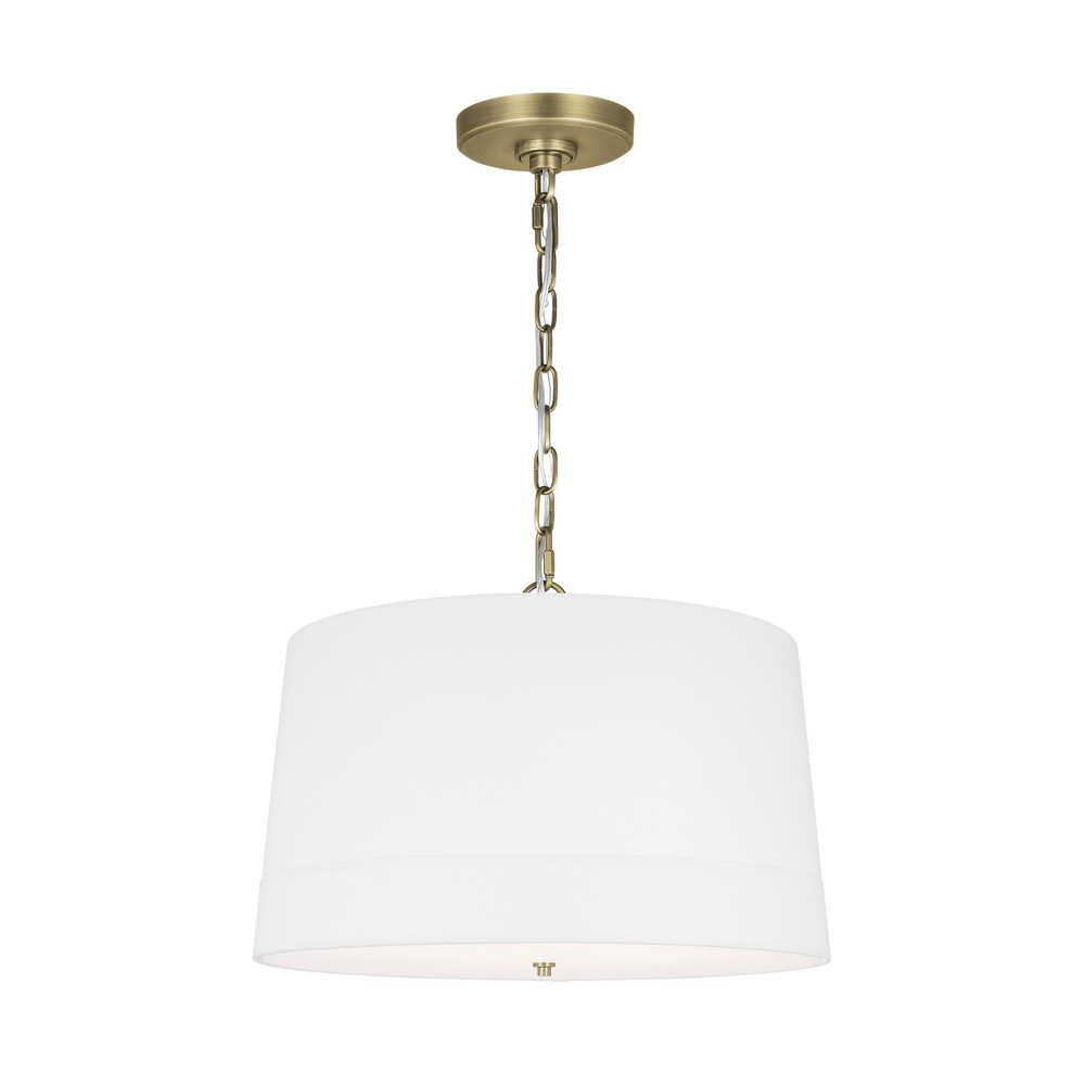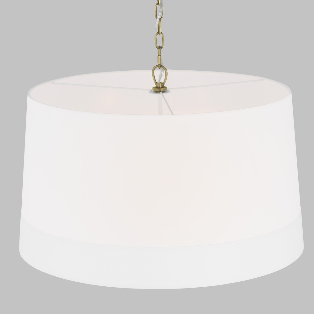 Ivie by Lauren Ralph Lauren is a modern, preppy hanging shade collection that has nautical appeal which gives it a coastal east coast Hamptons vibe. The sleek, fabric shades and etched glass diffusers of the Ivie shade pendant combine to create a warm glow. Finished-off with decorative metal finials to secure the etched glass diffusers in place, these fixtures convey a tailored look while creating both ambient and task lighting. The assortment includes a tall, medium and wide pendant all with classic drum shades, and all are offered in a Time Worn Brass finish. Both incandescent lamping and ENERGY STAR-qualified LED lamping are available; all fixtures are California Title 24 compliant.
