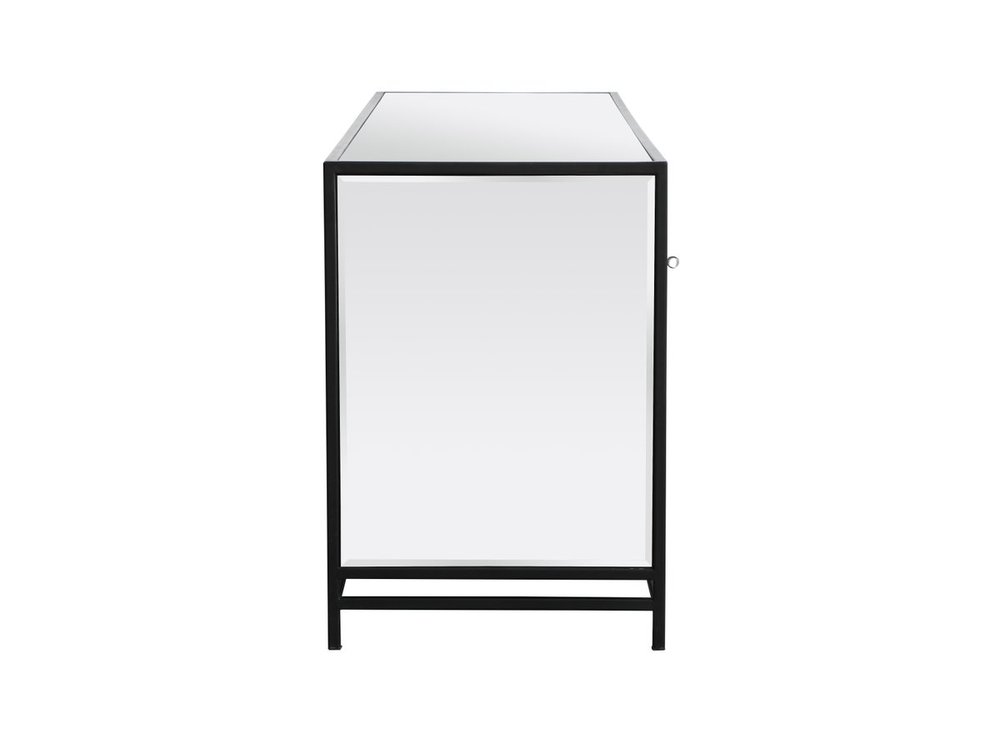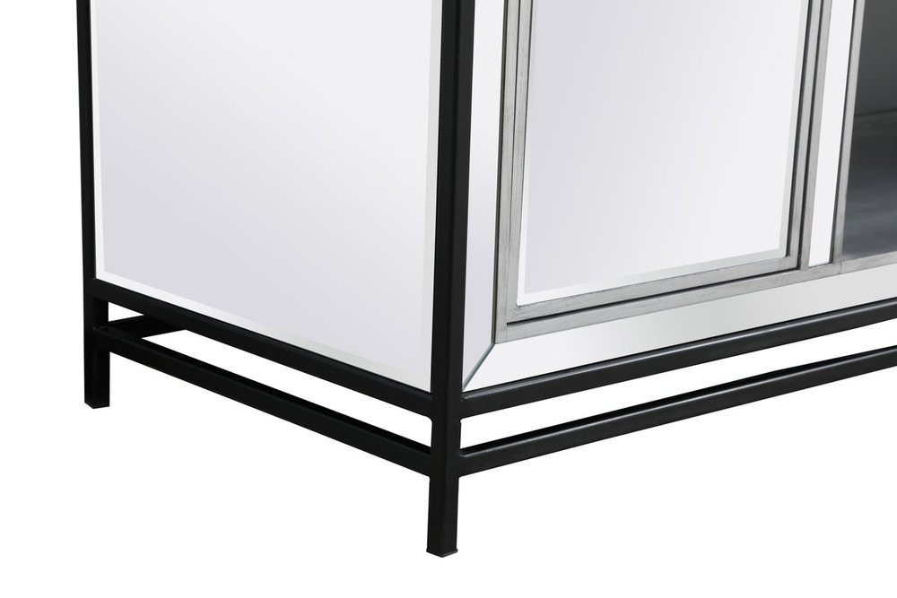 Crafted with mdf, clear mirror panels, and acrylic knobs with metal accents