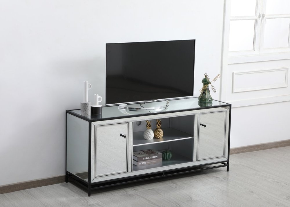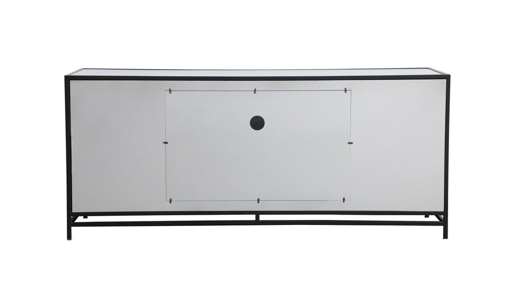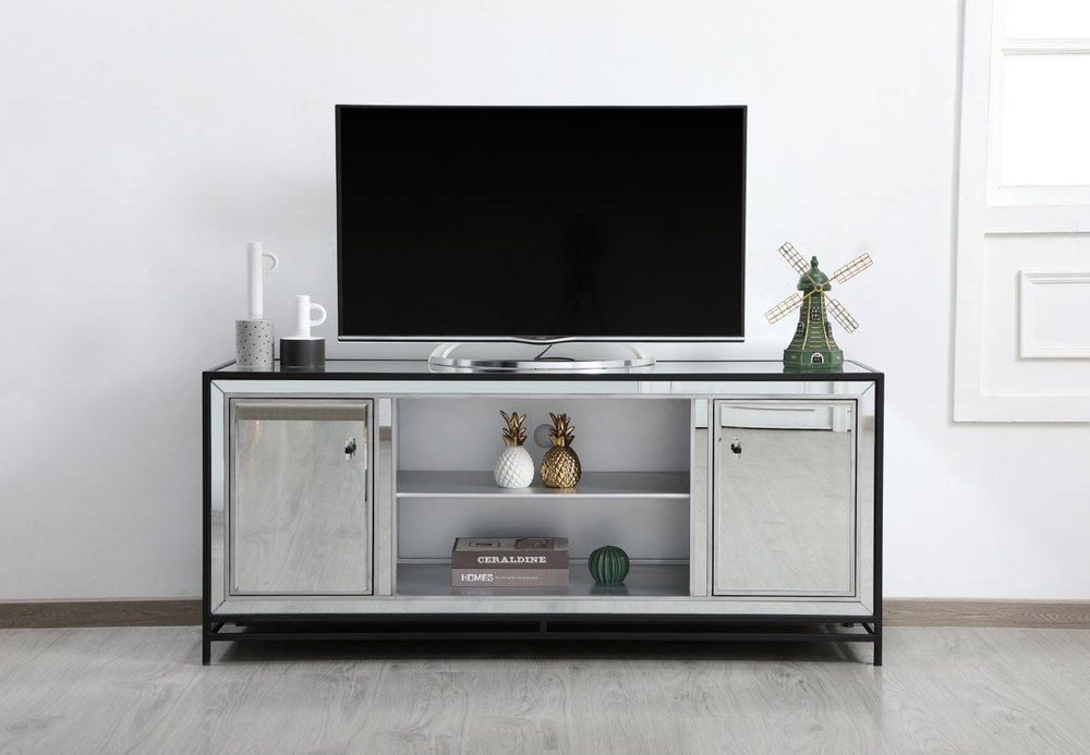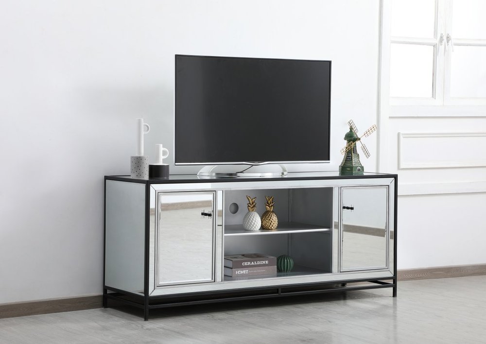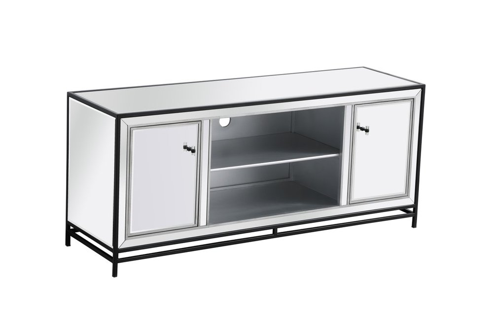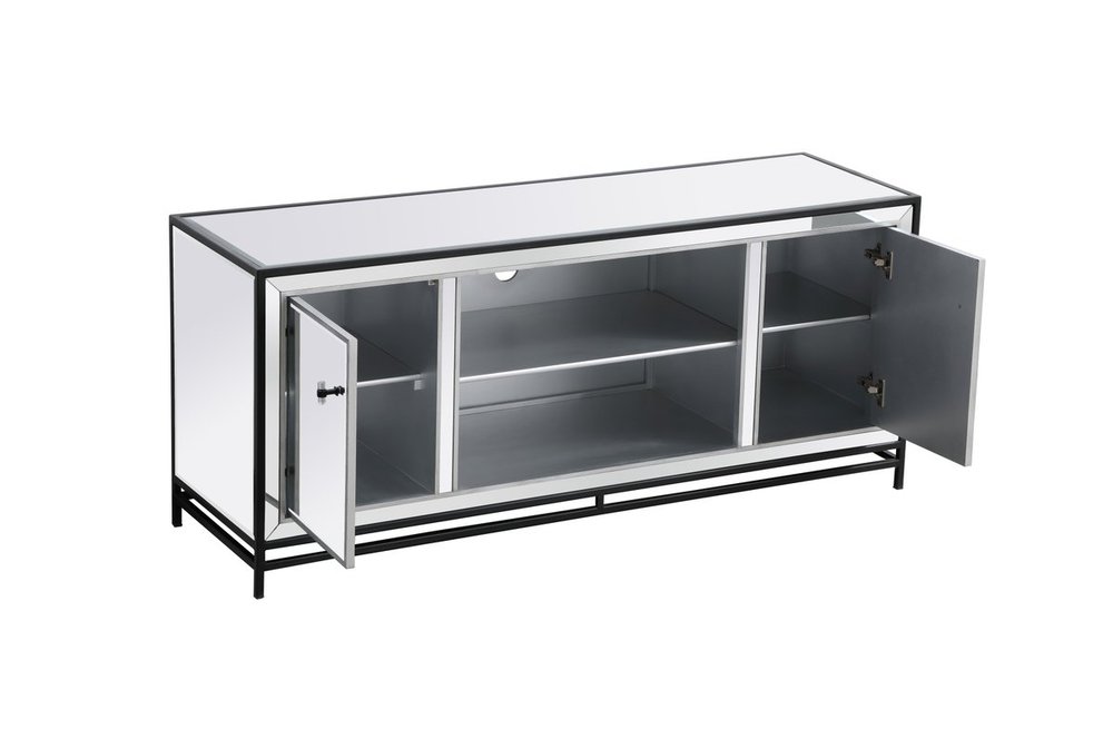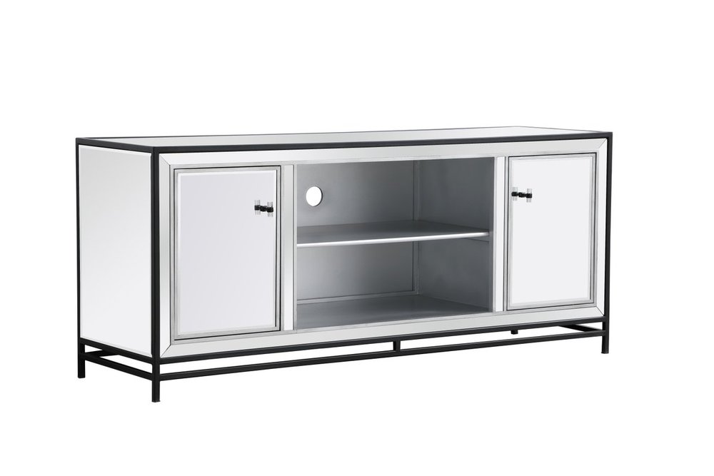 Sleek and vibrant, this modern media cabinet will make a striking statement in any room can showcase up to a 55" flat screen TV at a perfect height. Featuring hand-rubbed silver finish, black steel frame and legs, and acrylic knobs. Functional and chic, with 2 soft-closing side doors, center opening and shelvings, it provides plenty of storage for your equipment, games, and books. Ships fully assembled and ready to use. Remove the middle shelf and you can add our fireplace insert (sold separately) to turn this into a multi-functional storage unit.