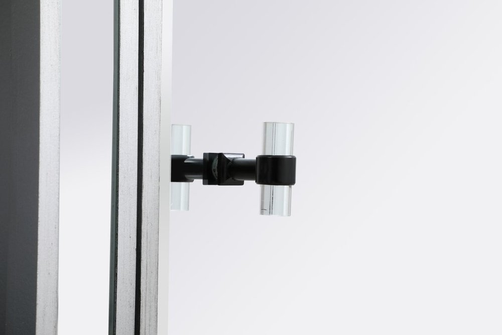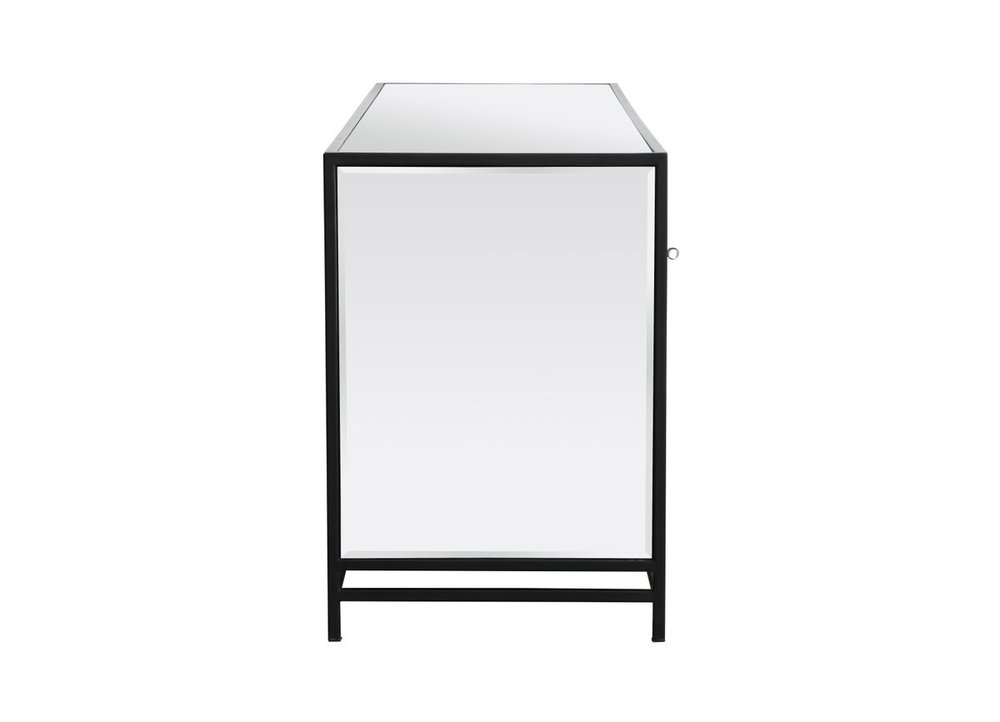 Crafted with mdf, clear mirror panels, and acrylic knobs with metal accents
