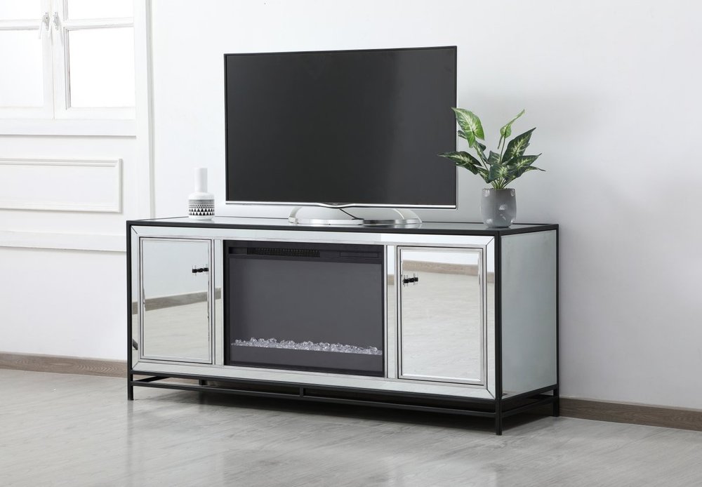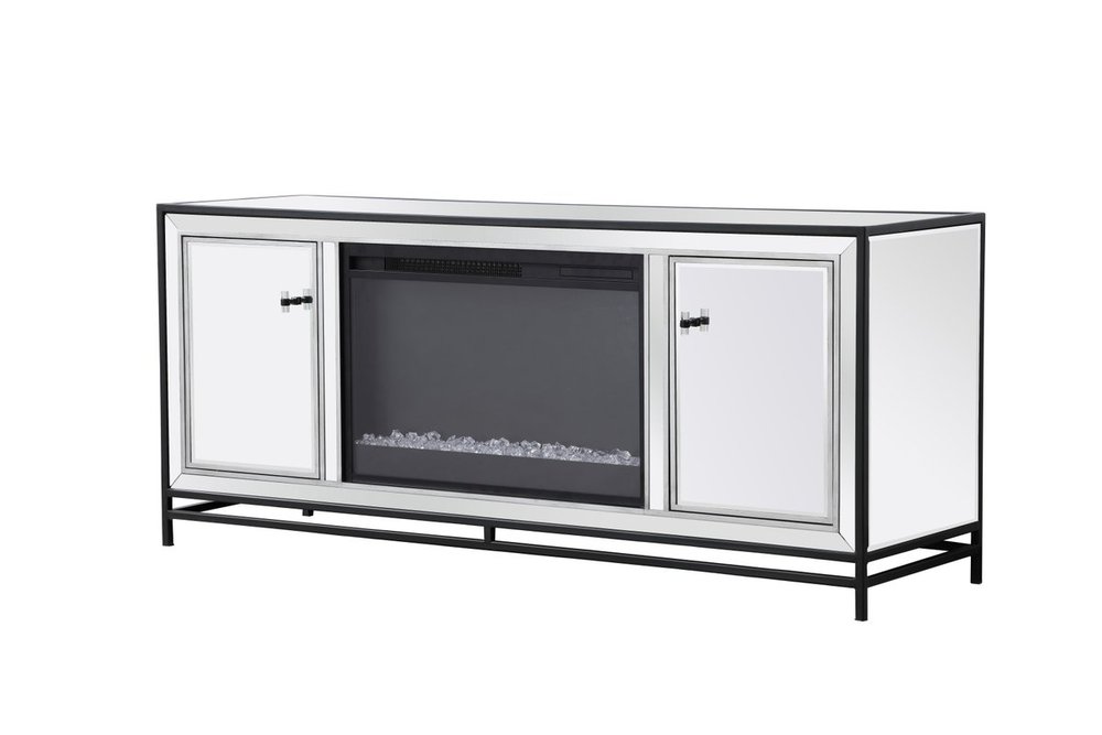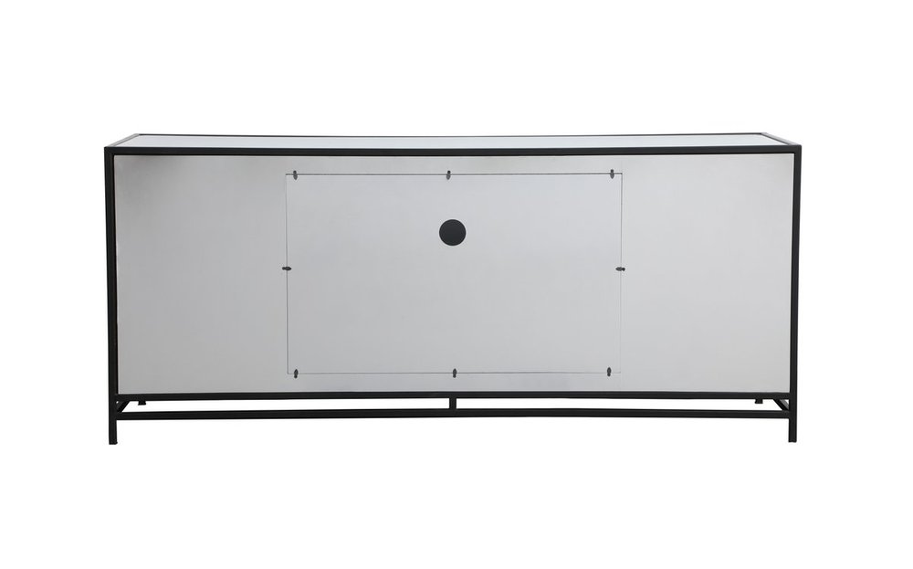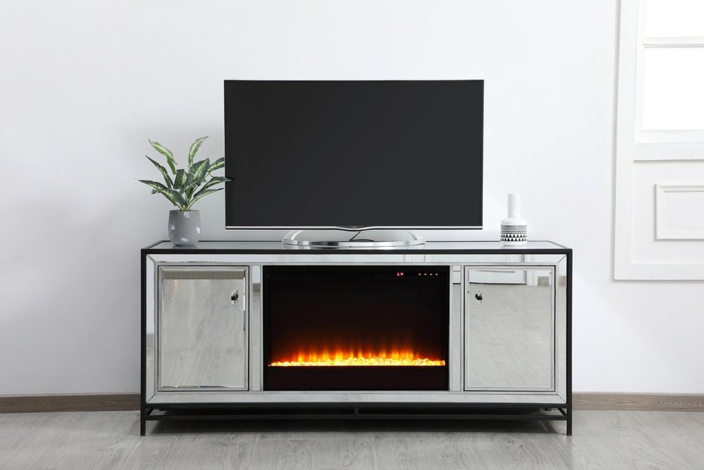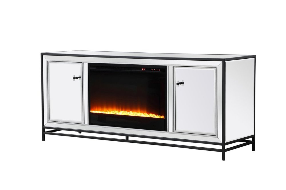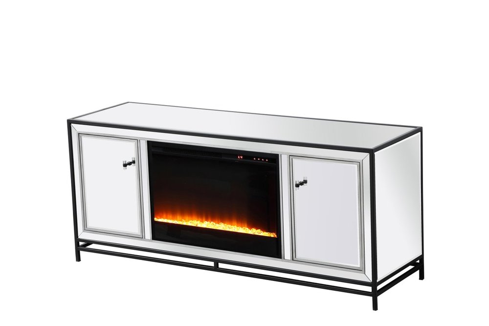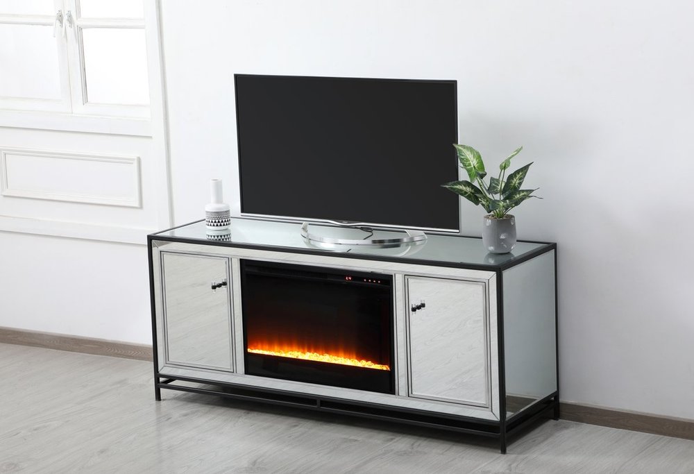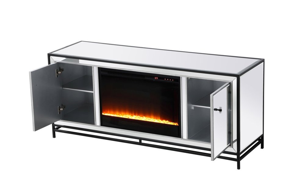 Sleek and vibrant, this modern media cabinet will make a striking statement in any room can showcase up to a 55" flat screen TV at a perfect height. Featuring hand-rubbed silver finish, black steel frame and legs, and acrylic knobs. Functional and chic, with 2 soft-closing side doors, center opening and shelvings, it provides plenty of storage for your equipment, games, and books. Ships fully assembled and ready to use. This includes the electric crystal fireplace insert that is easy to install into the cabinet. Set the mood with adjustable temperature and lighting settings.