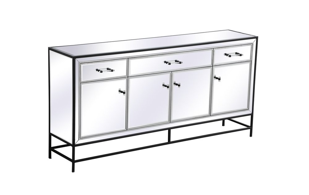 Bring plenty of storage space and modern style to your living room, dining room or entryway with this mirrored credenza. This was made to withstand everyday use. Deep drawers to hold up to 66 pounds and opens quietly. Four doors open to reveal one shelf in each cabinet for barware, fine china, and table linens. This versatile credenza blends in easily with any décor and easy to maintain. Ships fully assembled and ready to use. With anti-tip straps included for added security, this modern addition will complete your room.