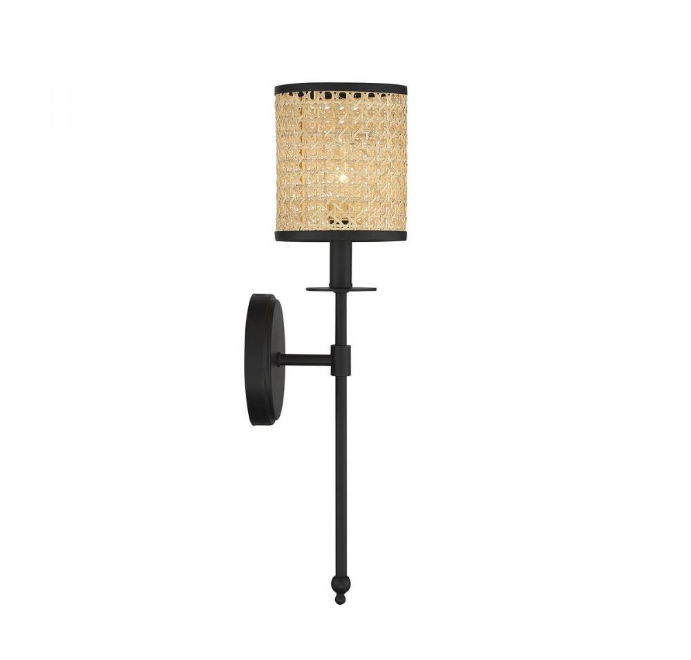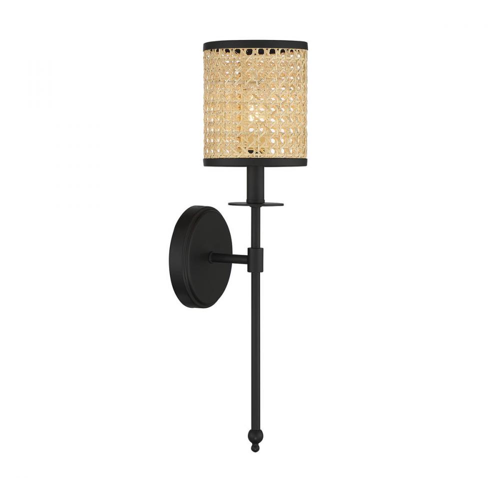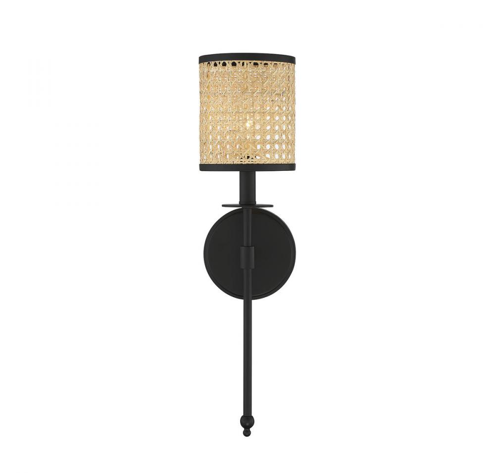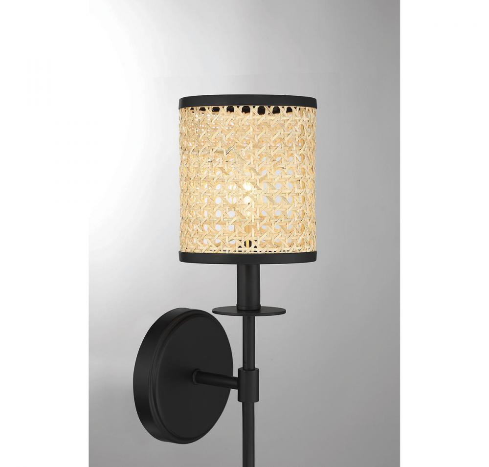 With the Savoy House Jaylar 1-light sconce, you can give any room a touch of relaxed organic style. A shade of woven cane brings texture and brightness while the long stem and matte black finish add another dimension of flair. Jaylar is 20" in height, 5" in width and extends 6" from the wall. It uses a standard size bulb of up to 60 watts. Damp area rated.