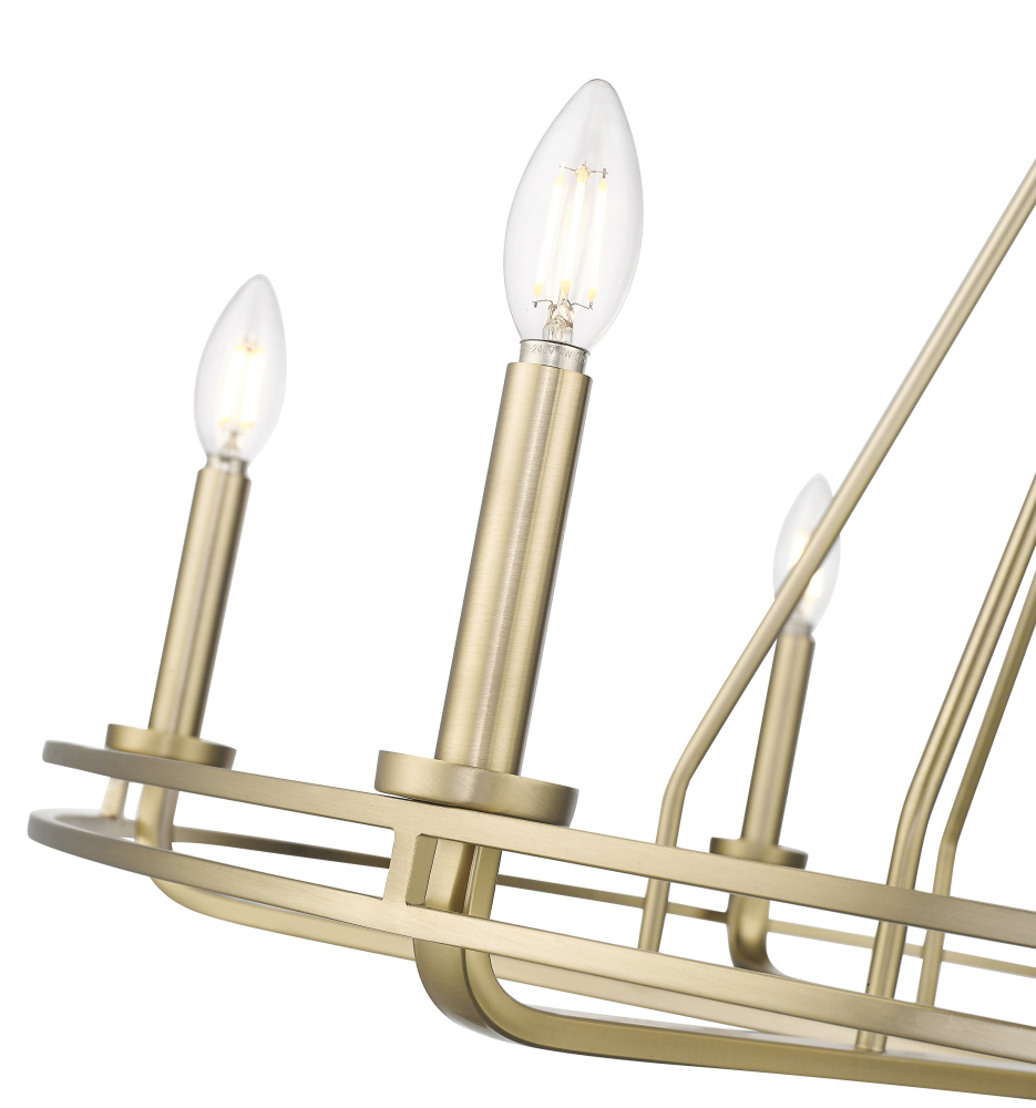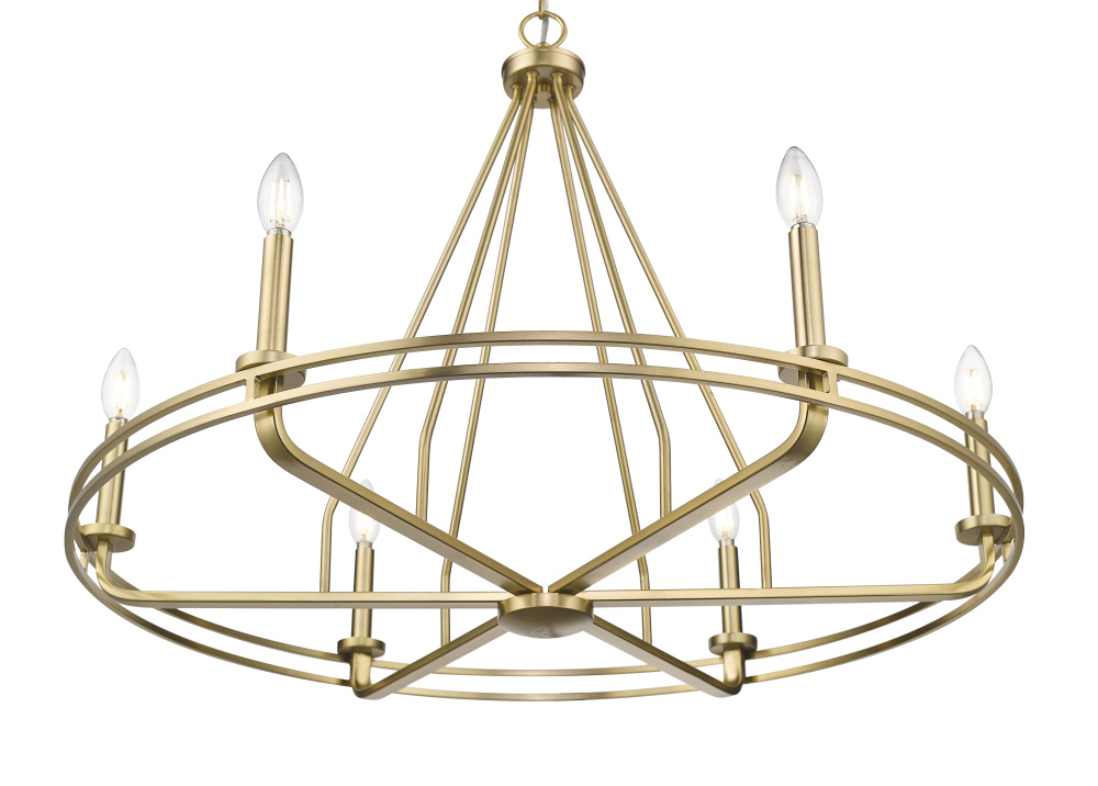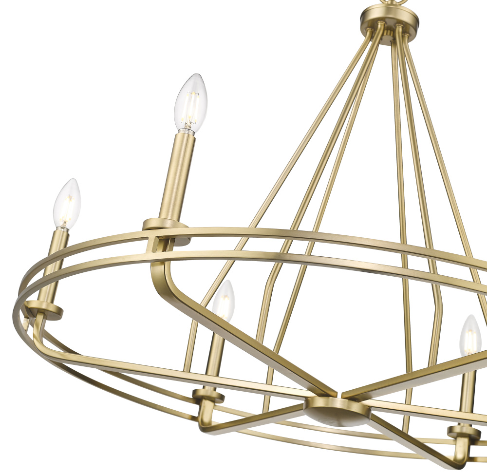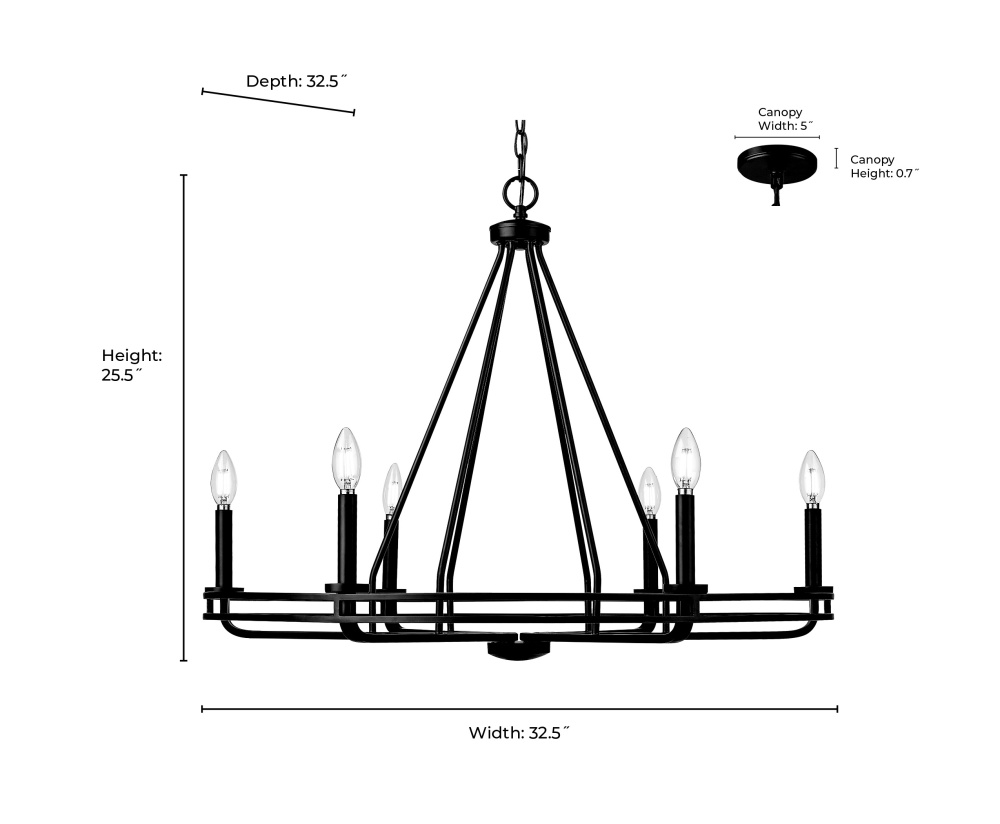 The Jody Family of chandelier lighting is a whimsical take on the traditional wagon wheel candelabra silhouette. Designed to create a dramatic impact, the fixtures feature radiating spokes supporting the dual circular frame and are available as 5- or 6-light options. Finished in either matte black or vintage brass, the result is a stunning fixture perfect for illuminating any dining space or grand entryway with stately simplicity.