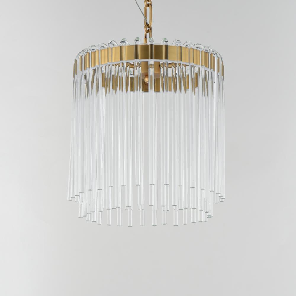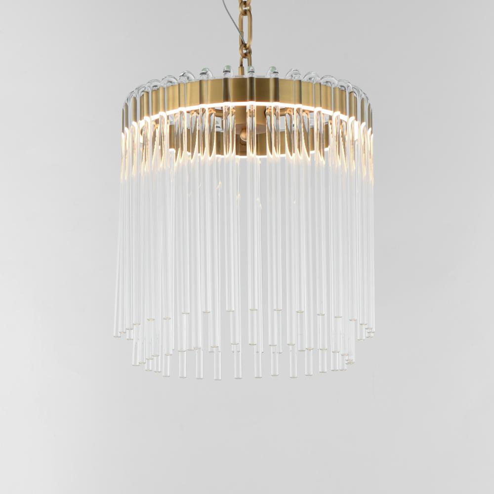 Clear glass rods elegantly curve to drape over a metal frame, encasing an integrated LED light source within. These ornamental glass rods form a luminous curtain, softly illuminated by the LEDs. The LED light source features an adjustable color temperature