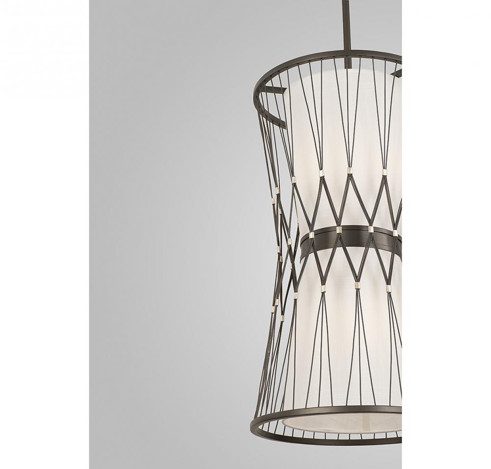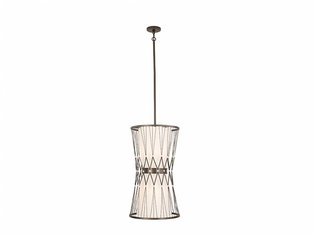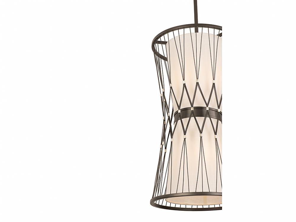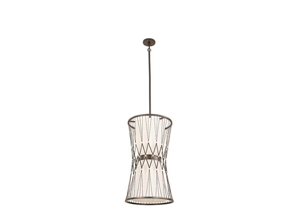 The Savoy House Joliet 6-light foyer pendant flaunts a curving look that brings organic style inspirations to mind. A central slender shade is surrounded by an outer shade with an intricate and eye-catching pattern of slender metal rods. The rich brown Rumba finish offsets the lighter-colored interior shade perfectly. Joliet is 28" in height and 16" in width. It uses 6 candelabra size bulbs of up to 60 watts each (bulbs not included). Comes with four 12" downrods and one 6" downrod.