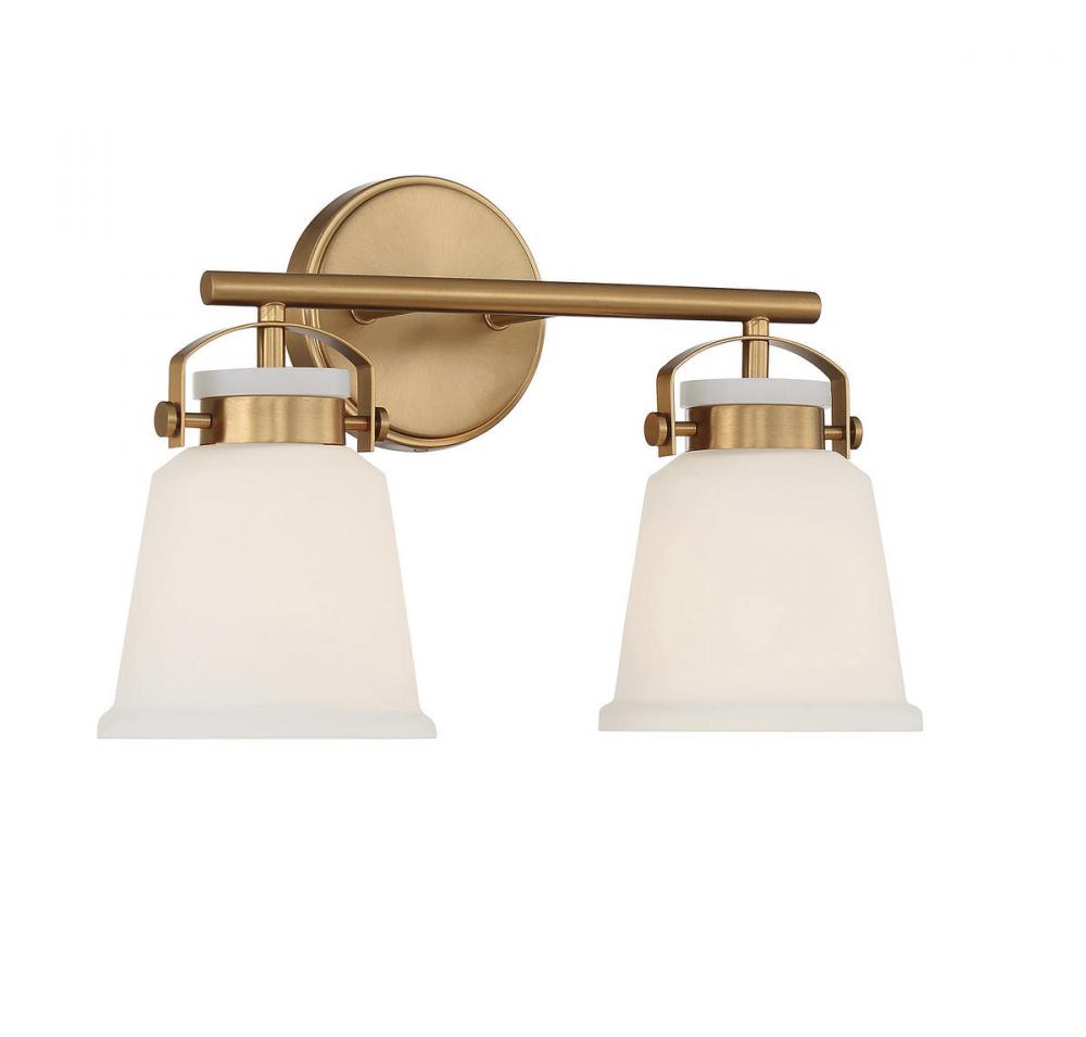 The Kaden 2-light bathroom vanity light from Savoy House has a classic look with a hint of industrial inspiration. White opal glass shades are held in place with eye-catching hardware that, like the bar and backplate, is finished in warm brass. Kaden is 10.5" in height, 16" in width and extends 7" from the wall. It uses two standard size bulbs with a max of 60 watts per bulb. Damp area rated.