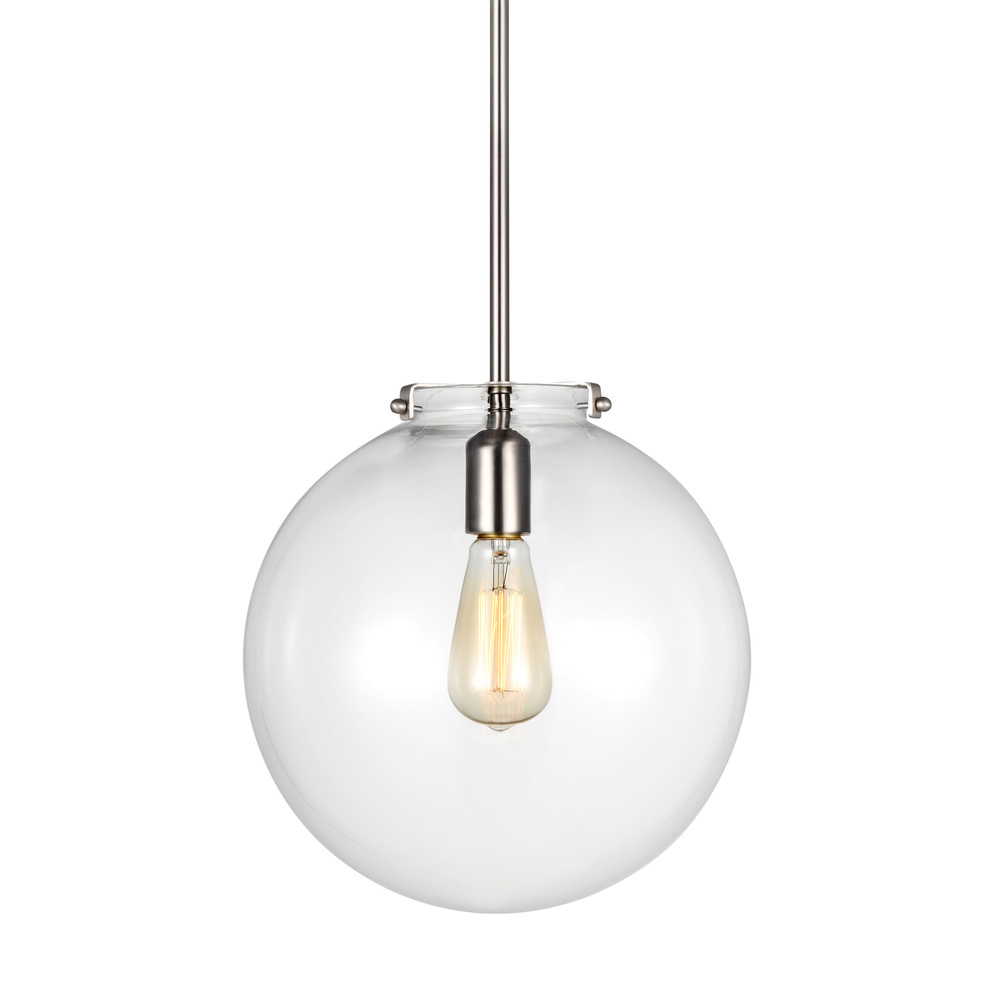 The Kate cone pendant is offered in the Satin Brass, Midnight Black, or Brushed Nickel finish. The flared, clear glass shade suspended from a linked chain defines sleek and simple, offering a chance to show-off any style bulb of your choice. The versatility of this fixture makes for a great transitional piece when changing your design or color themes.