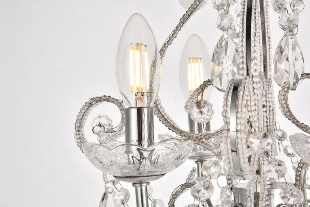 Experience the grandeur of classic rococo ornamentation in the compact fixtures of the Kato collection. These pendants feature fanciful curved, beaded arms festooned with beautiful strands of cockled Crystal flowers and accented with royal-cut Crystal almond droplets. Available in a polished-Black finish with Black Crystals or a Chrome finish with clear Crystals. Ample illumination is provided by four candelabra-style bulbs (Not included) atop coordinated bobèches.