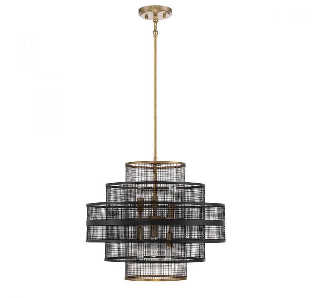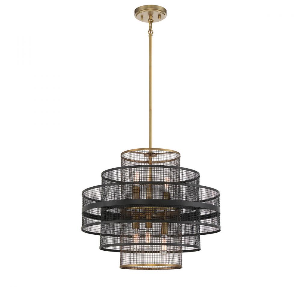 Three shapely shades of matte black mesh overlap and create heightened drama in the Savoy House Kelvin 6-light pendant light. Paired with warm brass accents, Kelvin takes industrial lighting style and adds a touch of glamour! It is 20" in diameter and has an adjustable height ranging from 22" to 68". Uses six standard size bulbs of up to 60 watts per bulb. Comes with four 12" downrods and one 6" downrod, plus 80" of cord.