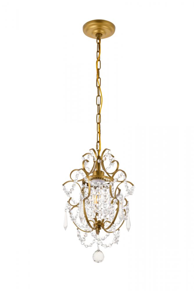 The Kirin pendant fixture is a dazzling bravura of visual whimsy, with swirling brass finish arms that dance around and through brilliant strands of beaded crystal chains cascading from a bright headpiece. The fanciful look also features crystal spears and a multifaceted crystal ball suspended below. This fixture packs a lot of appeal into a relatively compact space (11 inches in diameter) and is sure to add a distinctive accent to a dining room, bedroom, or foyer.