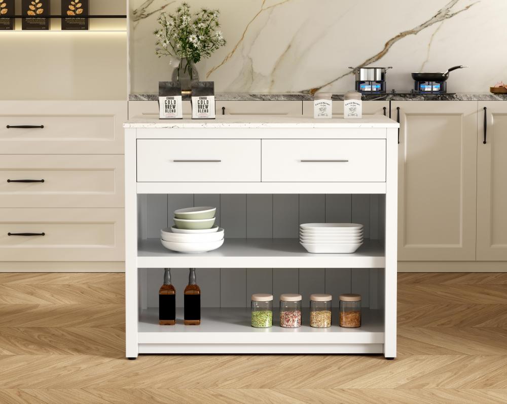 Designed for both practicality and style, the island includes two soft-close drawers with French dovetail construction for storing your kitchen tools and an open shelf for additional storage or display. Built from solid wood and MDF, this island is as durable as it is stylish. It’s available in three finishes—blue, natural oak, and white—offering flexibility to complement your kitchen’s aesthetic. with the added convenience of adjustable foot levelers for stability and shipping fully assembled, this kitchen island is ready to elevate your space in no time.