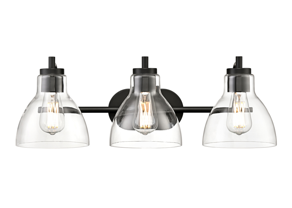 Refined simplicity is the hallmark of the Knightsdale Family of vanity lighting. Graceful bell-shaped clear glass shades set an elegant tone and provide a crisp clear lighting effect perfect for any bath. The minimalistic hardware strikes the perfect balance with the shades and is finished in matte black, chrome, or modern gold. Available as 1, 2 and 3-light options, these fixtures create a sleek and understated profile.