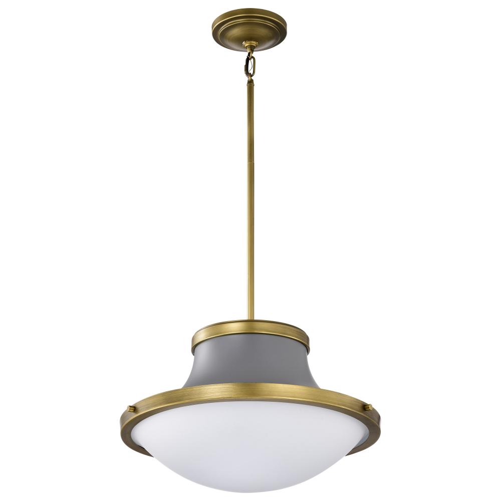The Lafayette 60-7918 large pendant is a beautiful transitional-style luminaire that features a matte gray finish with a white opal glass shade. The design combines elements of both traditional and contemporary styles with clean lines and a simple shape, a