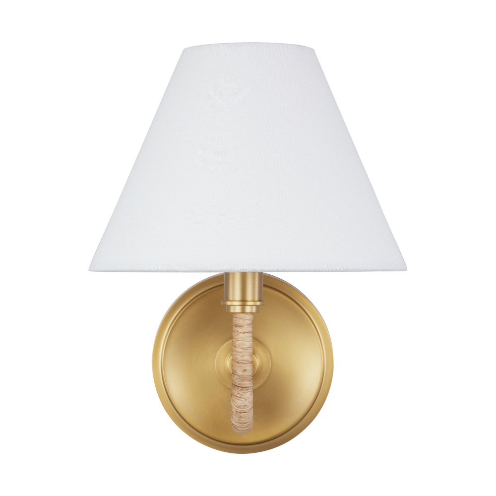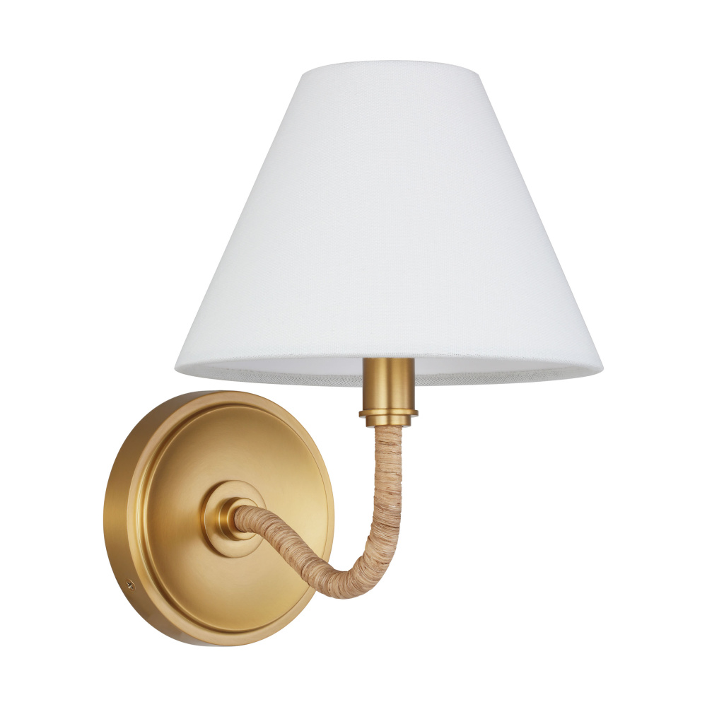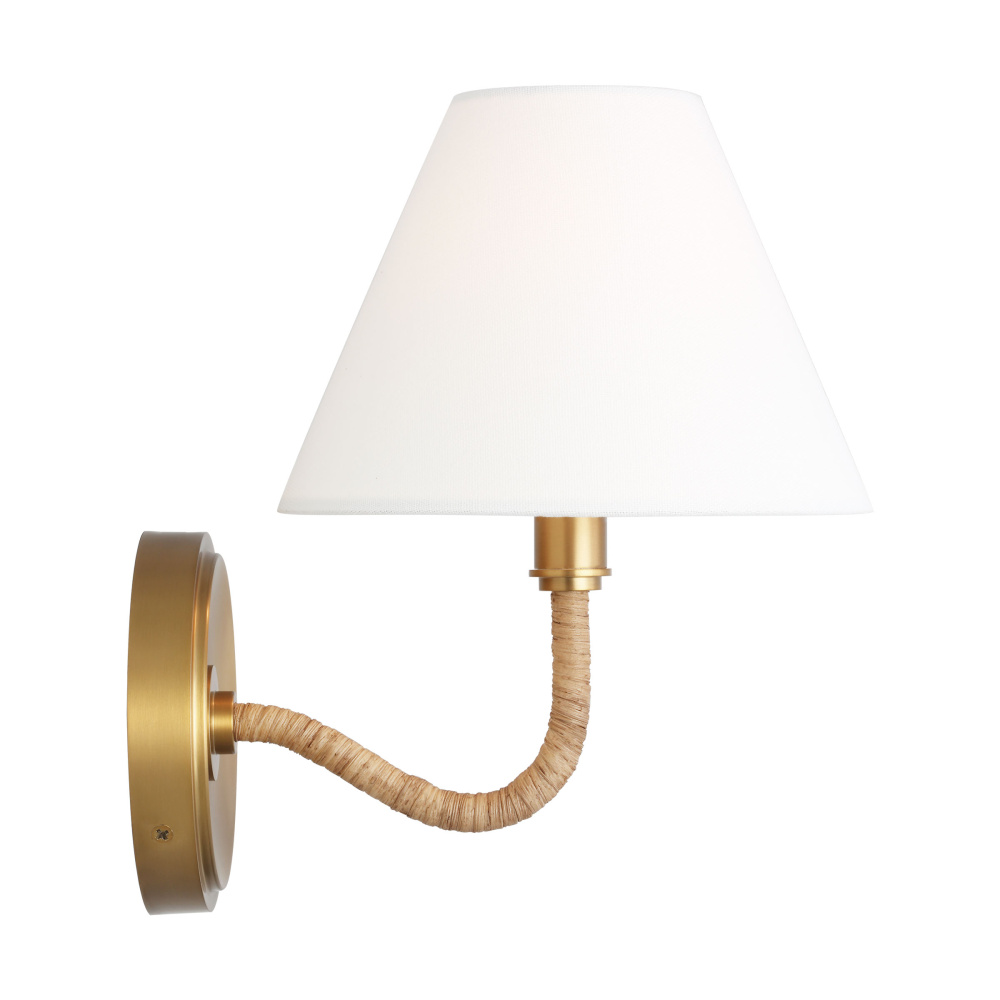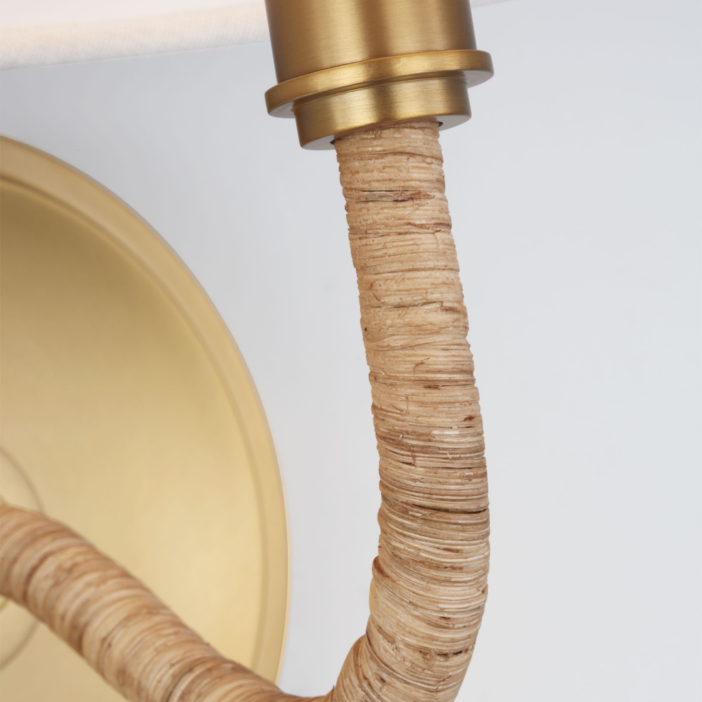The sinuous forms of Jean Royere inspire the Laguna series, showcases a tight woven design that transitions to the shade. The natural woven wrapped frame of each piece in this series is elevated by the metal details adorning them. The curves and angles of the Laguna series bring modern flair to this sconce, while the white linen shades underscore its timeless elegance.