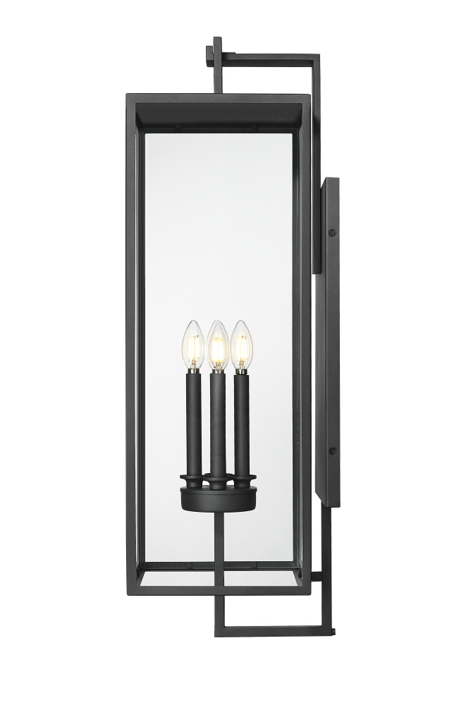 A contemporary interpretation of Victorian Gothic design, the Lamont Collection of outdoor lighting is designed to make a bold visual impact on any entryway. The succinct lines of the steel framework create an elongated, multi-dimensional fixture finished in durable textured black. The partial, clear glass panels reveal classic style candles in 1, 2, 3, and 4-light options. The fixture’s overall profile melds perfectly with any modern exterior or adds a dynamic twist to classic architectural styles.