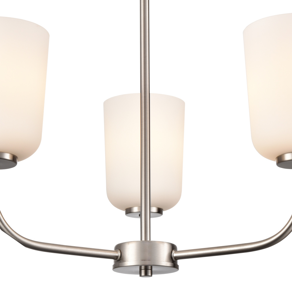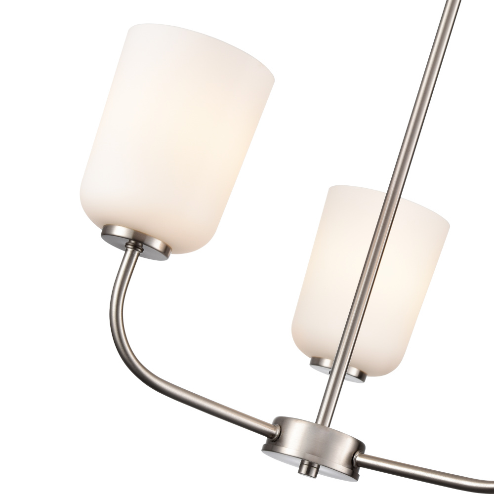 The Laphia Family features sleek lines, a graceful profile, and brilliant white, bell-shaped glass shades creating an ambient glow. The Family is available as sconce, chandelier, pendant, mini-pendant, semi-flush mount, flush mount, and an excellent vanity task light. Perfect for any interior plan from Craftsmen to modern farmhouse, these fixtures are finished in stylish brushed nickel, matte black, or modern gold.