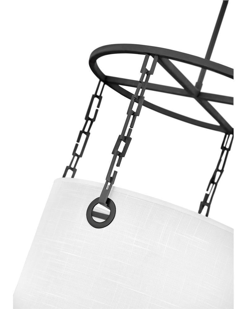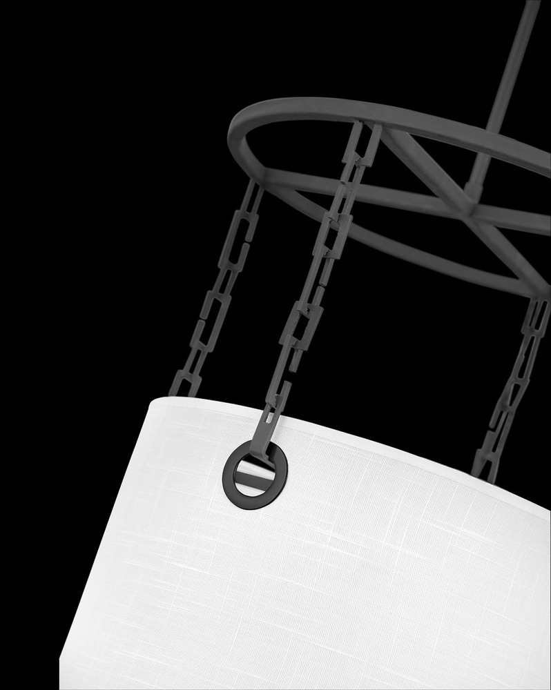 Tribeca’s modern drum pendant design thrills with edgy details. A custom Black chain suspends the crisp white drum shade, held in place by the oversized Black metal grommets and circular gridwork frame.