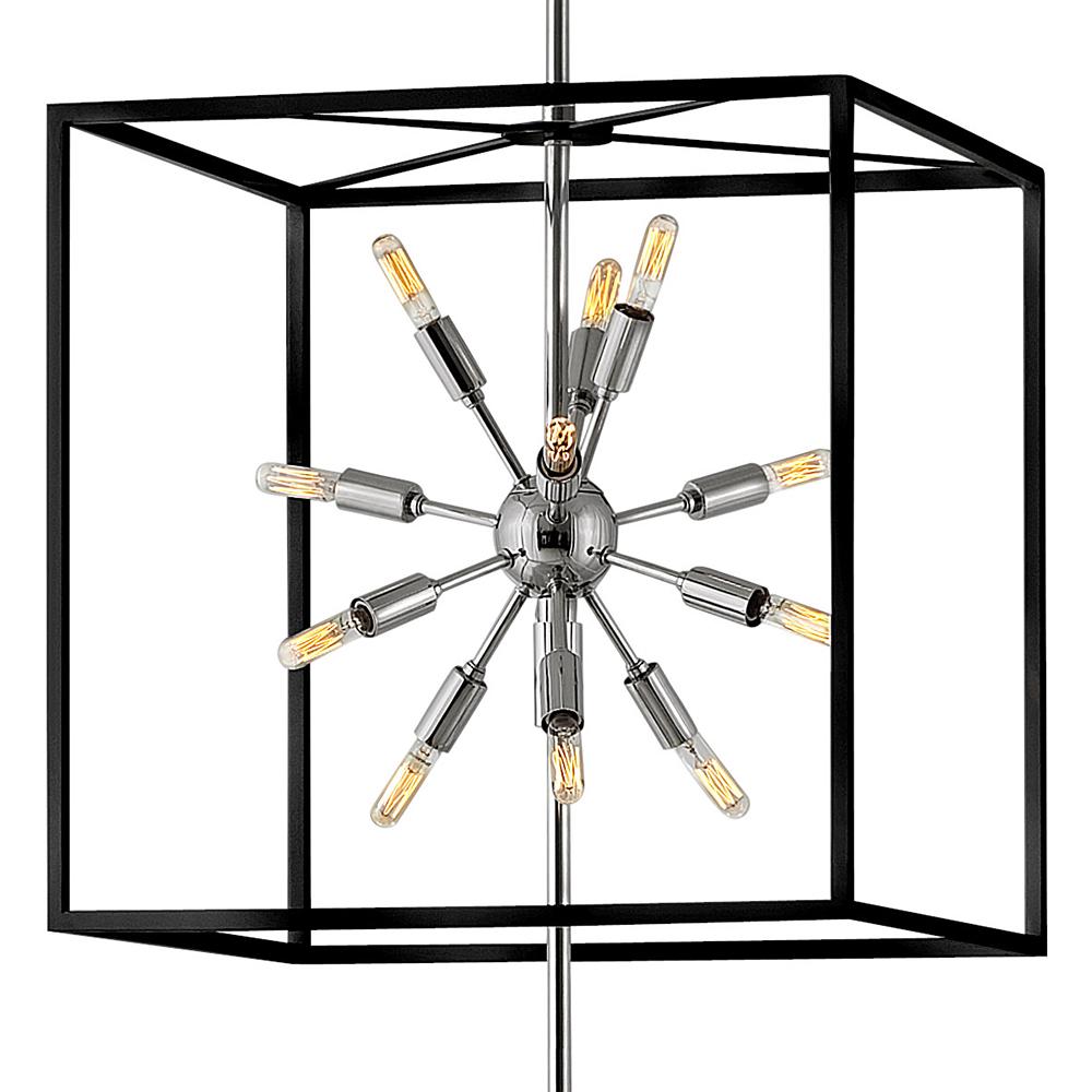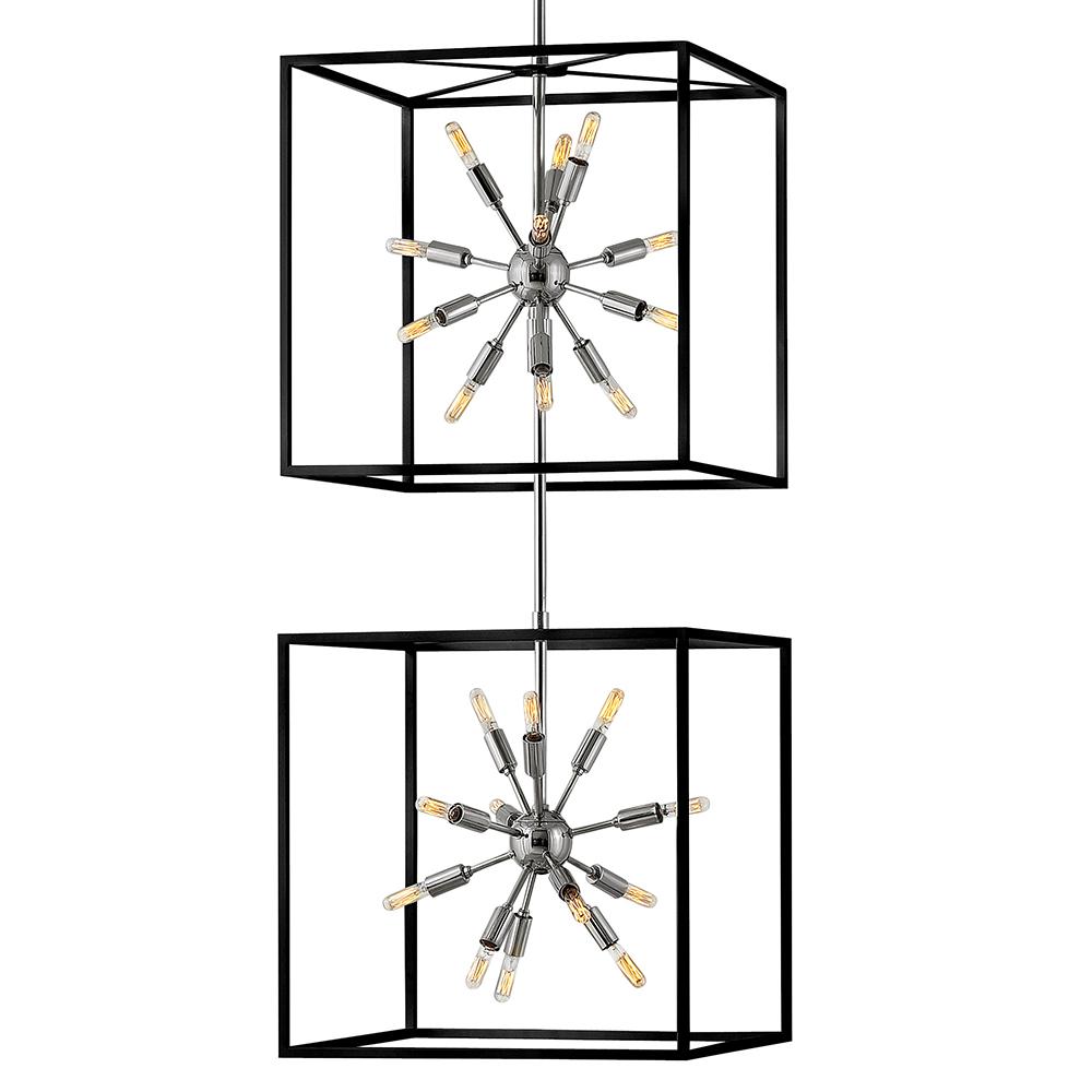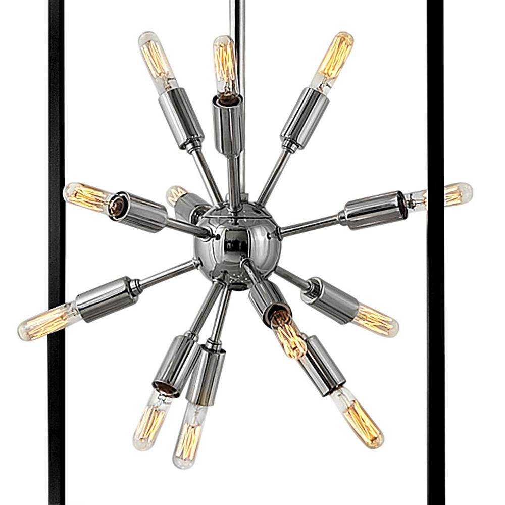 The striking Aros pendant showcases a provocative mid-century modern starburst cluster in a luxurious Warm Brass or Polished Nickel framed by an articulating, angular cage in prominent Black. For added drama, the sophisticated pendants dazzle with dimension to fill unique spaces or higher ceilings. Aros is part of the Lisa McDennon Collection.