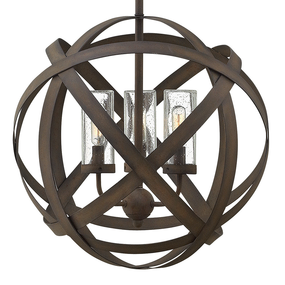Carson features bold overlapping metal ribbons of Vintage Iron, enhancing an outdoor living area with style and substance. The handcrafted pendants combine a hint of industrial sophistication with the allure of artisan craftsmanship.