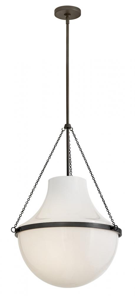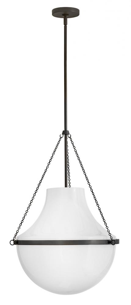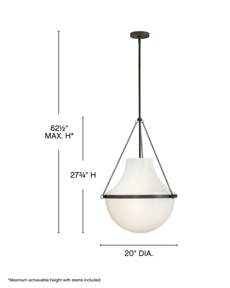 Fusing a sculpted, modern form with classically styled details, Collins features a transitional teardrop shade crafted from blown, cased opal glass. A central metal band and delicate chain uprights are available in Heritage Brass or Black Oxide finishes.