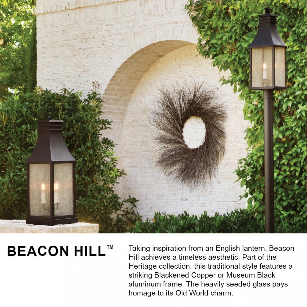 Taking inspiration from an English lantern, Beacon Hill achieves a timeless aesthetic. Part of the Heritage collection, this traditional style features a striking Blackened Copper or Museum Black aluminum frame. The heavily seeded glass pays homage to its Old World charm.