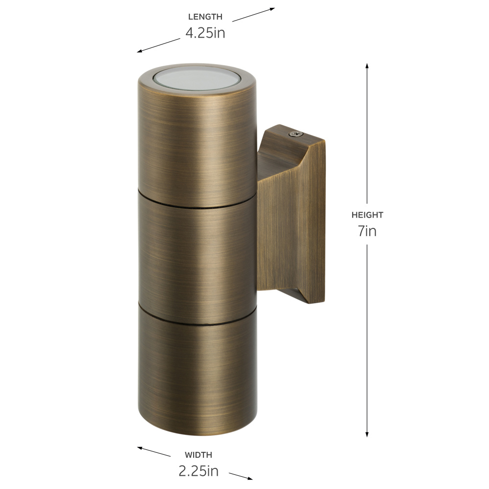 Elevate your outdoor lighting with the elegance, functionality, and resilience of the large up & down sconce. Constructed from solid, cast brass, this sconce is designed to withstand harsh weather and coastal conditions all year round. Its flush lenses prevent water accumulation while its threaded and sealed construction protects against water ingress. As versatile as it is practical, its 1 upward facing MR16 Bi bin and 1 downward facing MR16 Bi Pin socket lamp base is optimized for Kichler LED drop-in lamps, providing easy installation and light output. Its reduced-size mounting bracket and hardware allow for clean, precise installations on narrow beams, rails, and posts”ideal for pool cages and screen room enclosures. Featuring dual-directional MR16 lamps, this fixture projects light both upward and downward, creating a stunning ambiance and unique lighting effect.