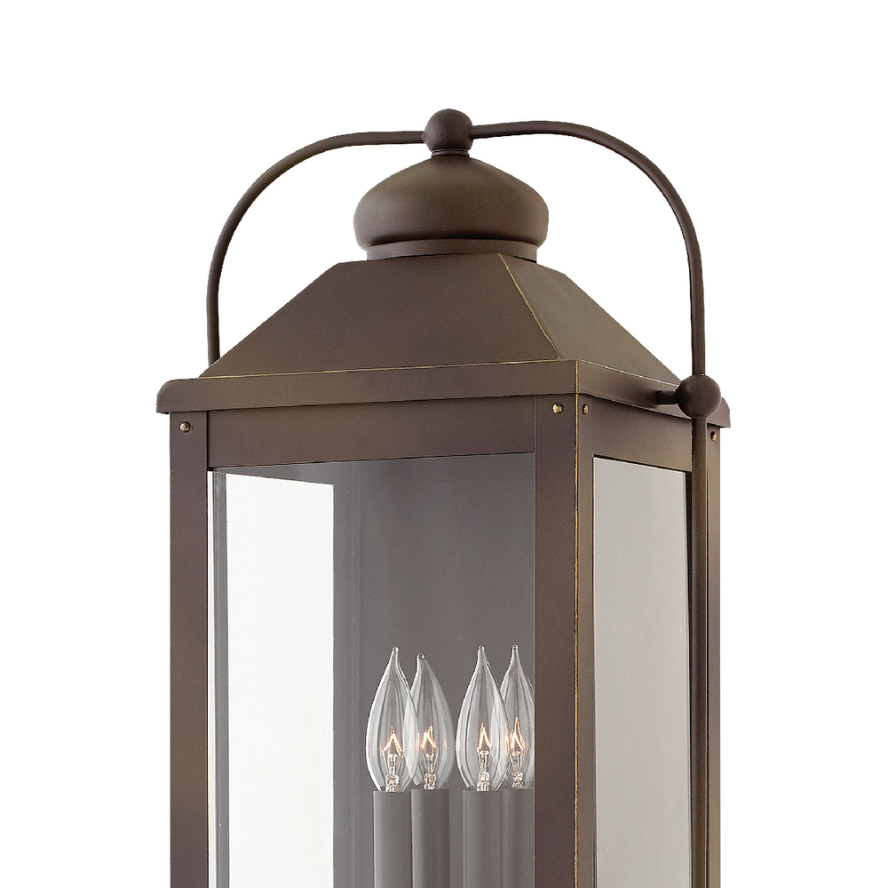 Anchorage is an early American lantern design crafted of solid aluminum to reflect a bold yet refined silhouette. The Aged Zinc or Light Oiled Bronze finish and clear glass complement the long clean lines, elegant arched carriage handle and sturdy knobs, resulting in a vintage style with classic charisma.