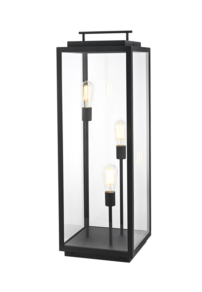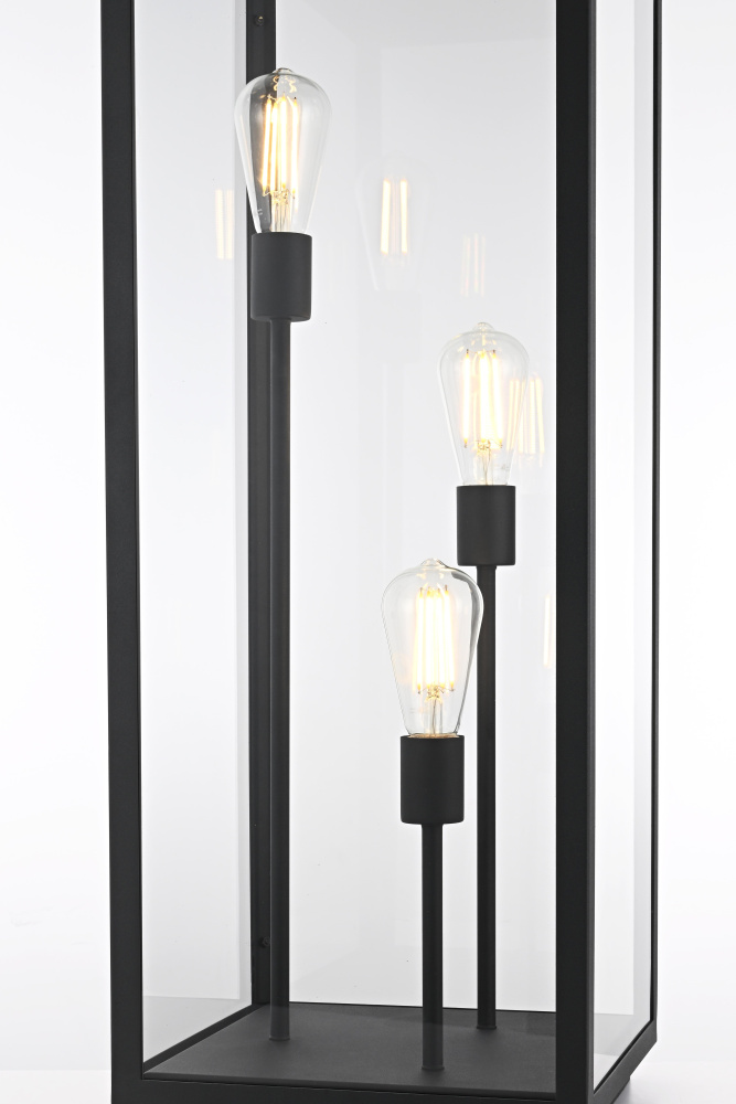 Transform an outdoor space with a striking lawn light that merges bold structure with practical illumination. A defined rectangular frame in matte black iron encloses three exposed bulbs, casting multi-directional light through crystal-clear glass panels. The staggered bulb placement enhances the design with depth and dimension, creating a floating effect that draws attention to landscaped pathways and garden features. A sturdy base ensures stability on various outdoor surfaces, while the wet-rated construction withstands rain and moisture for long-lasting performance. Designed with three E26 sockets (bulbs not included), this statement lawn light offers versatility with Edison, LED, or traditional bulbs. Whether highlighting a garden pathway or adding ambiance to a courtyard, this architectural lantern makes a commanding outdoor presence.