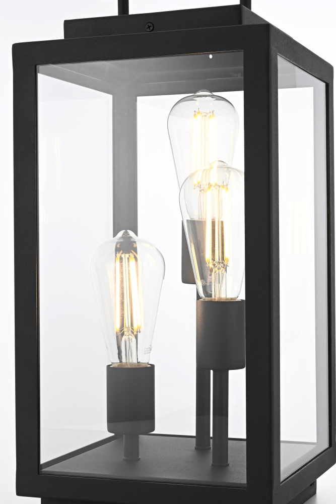 Transform an outdoor space with a striking lawn light that merges bold structure with practical illumination. A defined rectangular frame in matte black iron encloses three exposed bulbs, casting multi-directional light through crystal-clear glass panels. The staggered bulb placement enhances the design with depth and dimension, creating a floating effect that draws attention to landscaped pathways and garden features. A sturdy base ensures stability on various outdoor surfaces, while the wet-rated construction withstands rain and moisture for long-lasting performance. Designed with three E26 sockets (bulbs not included), this statement lawn light offers versatility with Edison, LED, or traditional bulbs. Whether highlighting a garden pathway or adding ambiance to a courtyard, this architectural lantern makes a commanding outdoor presence.