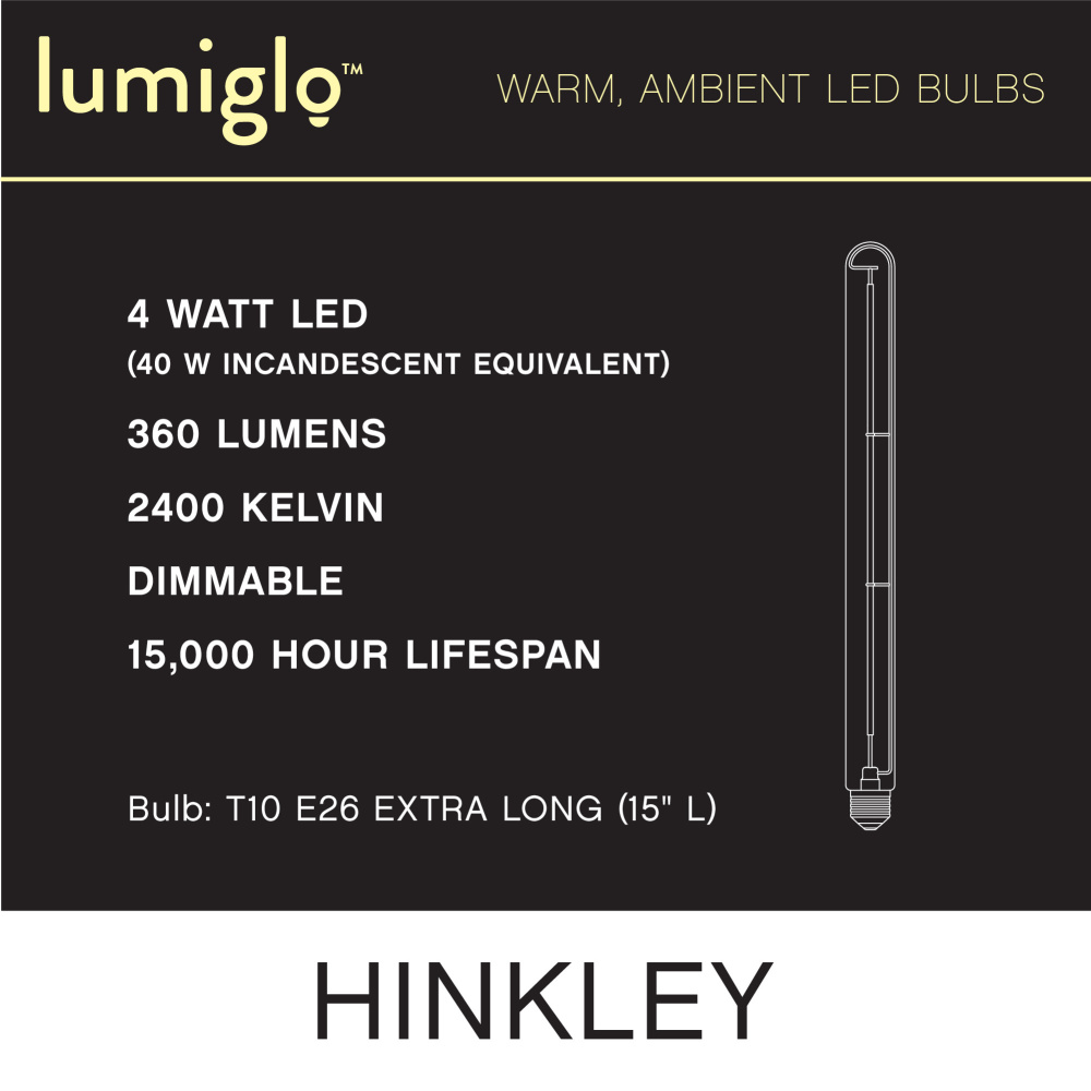 To create superior, softer light that sets the scene in any indoor or outdoor setting, Hinkley’s Lumiglo™ LED bulbs feature unique filament technology designed to cast a warm ambient glow. Dimmable functionality provides full control over brightness, allowing you to craft an atmosphere that perfectly accentuates your space.