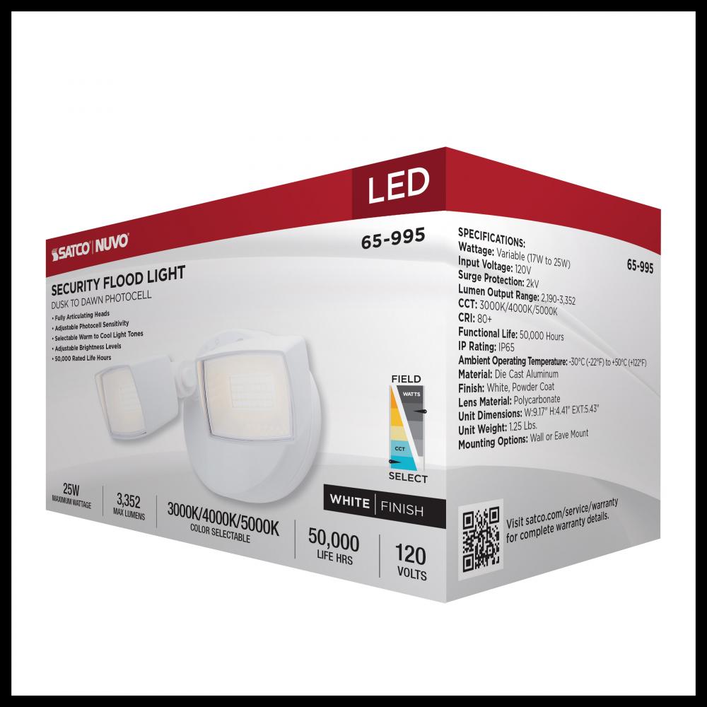 The SATCO NUVO 65-995 field-selectable dual-head LED security flood light sets a new standard for reliable and versatile safety lighting. Ideal for both residential and commercial use, this fixture can be easily mounted on walls or eaves to illuminate crit