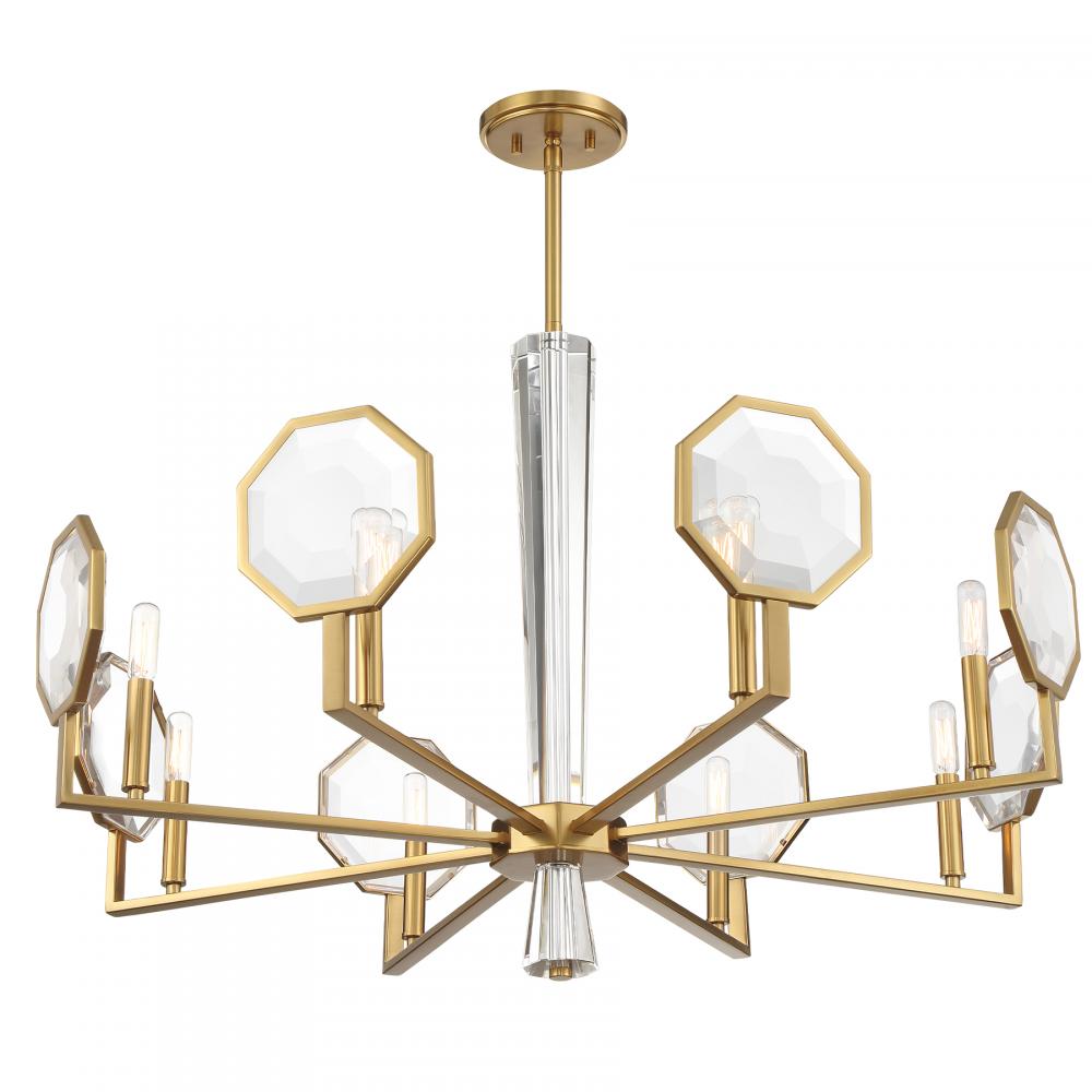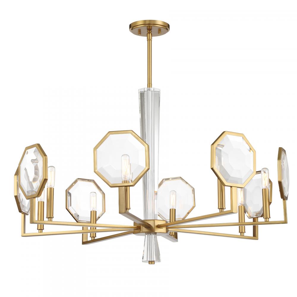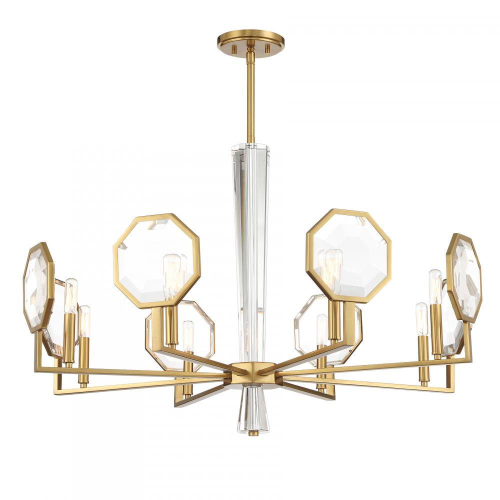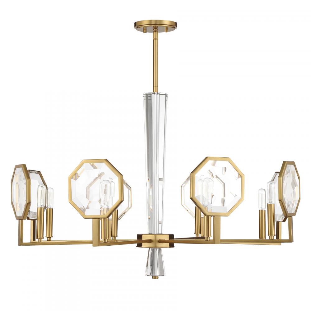 The gorgeous and geometric Savoy House Leighton 8-light chandelier is sure to become a spectacular focal point in your home. A clear crystal central column is flanked by flat, angular arms that each hold a large faceted K9 crystal shade in an octagonal shape. The Warm Brass finish is a perfect match. Leighton is 36" in width and has an adjustable height ranging from 24" to 80". Comes with four 12" downrods and one 6" downrod. Uses eight candelabra size bulbs of up to 60 watts per bulb. Bulbs not included.