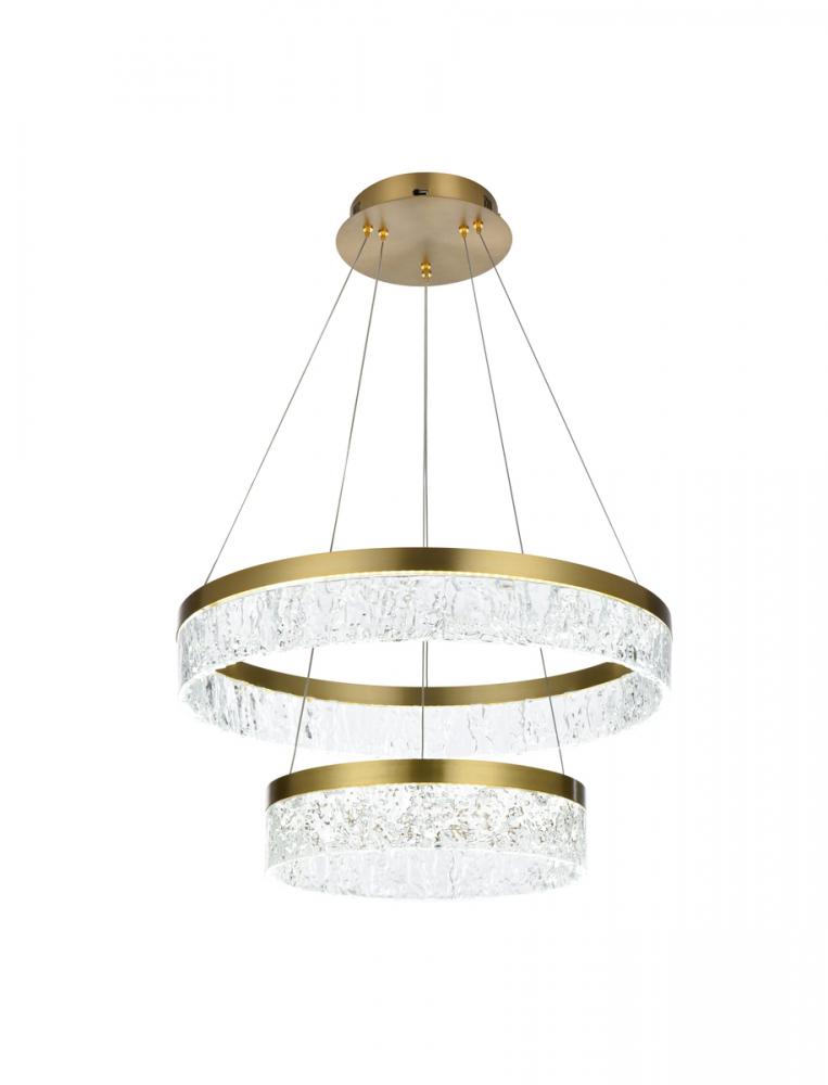 Illuminate your space with our 22-inch chandelier, showcasing a distinctive two-tier ring design that gracefully diffuses ambient light through captivating ripple-cut crystal elements, adding a touch of modern elegance to your surroundings.
