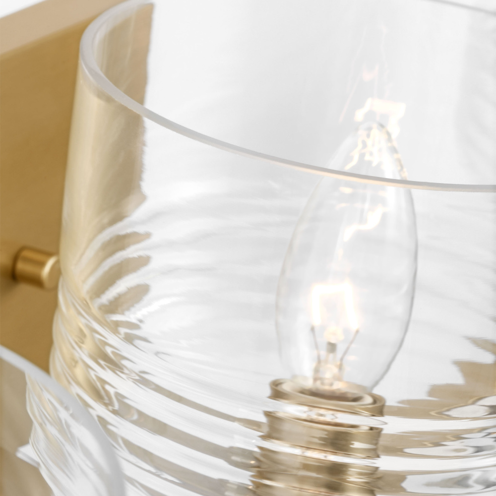 Crafted with Steel in a Satin Brass finish with clear ribbed glass shades