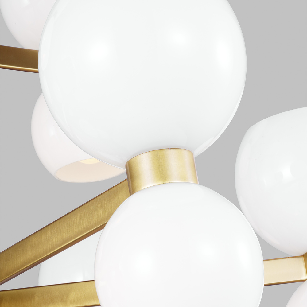 Rectangle stock metal rods and a playful layout of blown milk glass globes in two sizes with elegant metal cuffs create visual interest.