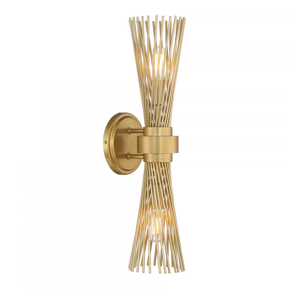 The Savoy House Longfellow 2-light sconce showcases a fashionable style with metal rods that are gathered together at the center and unfurl outward. When the lights are on, it creates a dramatic glow that is sure to catch the eye. Burnished Brass finish. Longfellow is 20" in height, 5.12" in width and extends 6" from the wall. Uses two candelabra size bulbs of up to 60 watts per bulb. Bulbs not included. Damp area rated.