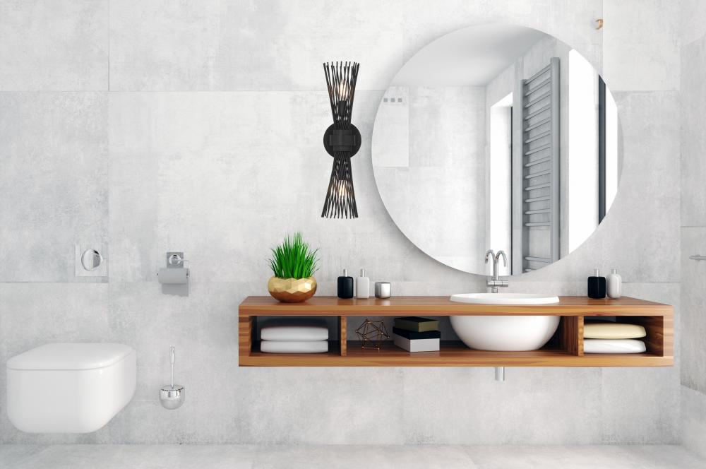 The Savoy House Longfellow 2-light sconce showcases a fashionable style with metal rods that are gathered together at the center and unfurl outward. When the lights are on, it creates a dramatic glow that is sure to catch the eye. Matte Black finish. Longfellow is 20" in height, 5.12" in width and extends 6" from the wall. Uses two candelabra size bulbs of up to 60 watts per bulb. Bulbs not included. Damp area rated.