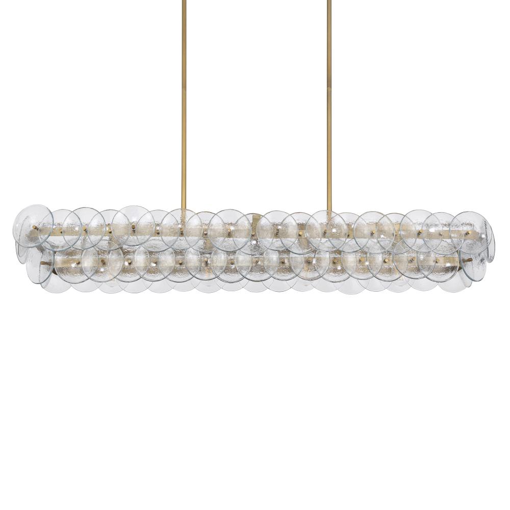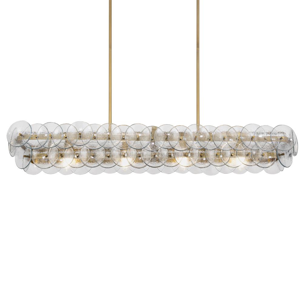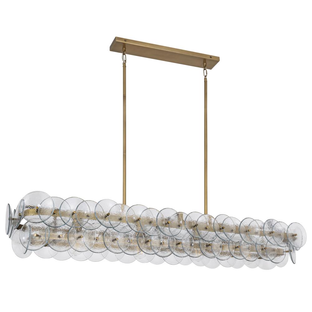 Overlapping handmade pressed glass disks mounted on metal frames inspired by Mid-Century Italian design, this collection offers a blend of vintage charm and modern elegance. Choose from Vintage Green glass on a Weathered Brass frame, or Amber glass on a Gu