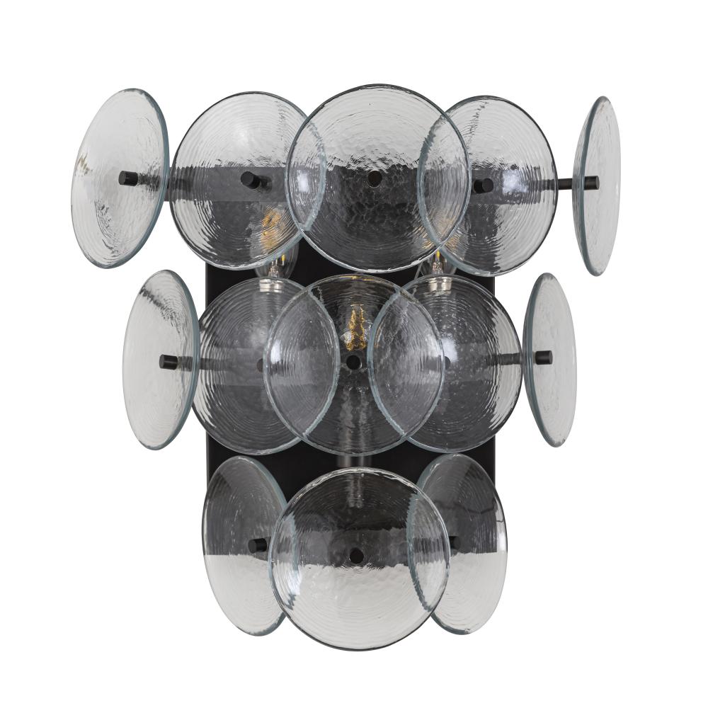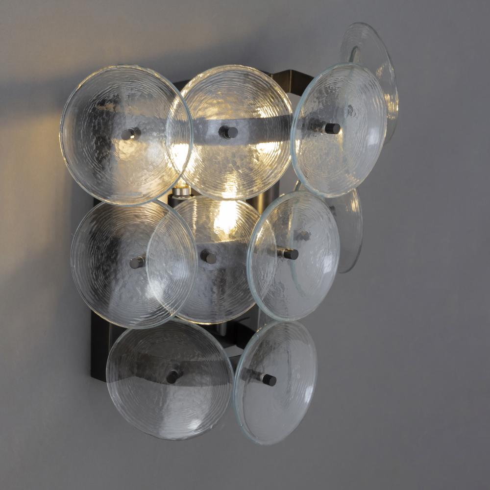 Overlapping handmade pressed glass disks mounted on metal frames inspired by Mid-Century Italian design, this collection offers a blend of vintage charm and modern elegance. Choose from Vintage Green glass on a Weathered Brass frame, or Amber glass on a Gu