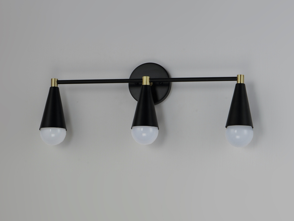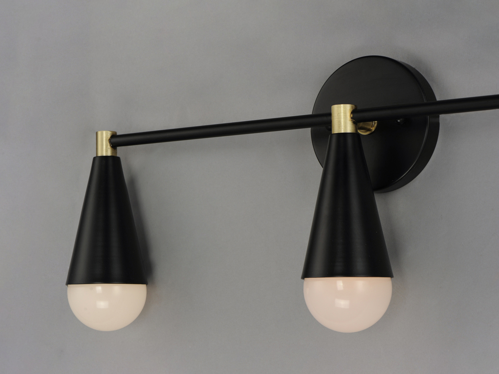 A classic mid-century look, the Lovell collection features two sizes of sputnik chandeliers and streamlined sconces perfect for bath vanity applications. Available in a Black/Satin Brass finish combination. Light bulbs nest inside the metal cones to become