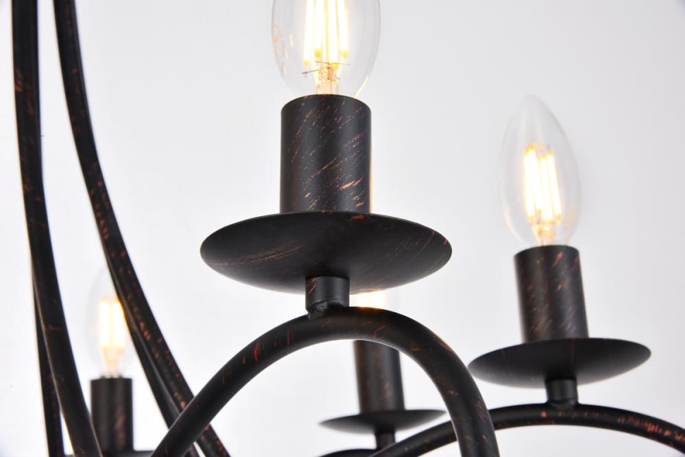 Lamp features a diameter of 28 inches, a height of 23 inches, a minimum hanging length of 29 inches, a maximum hanging length of 83 inches, and requires 8 candelabra bulbs