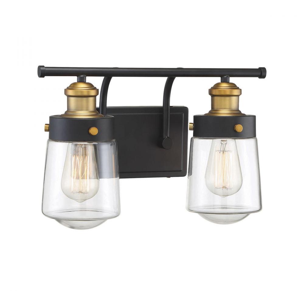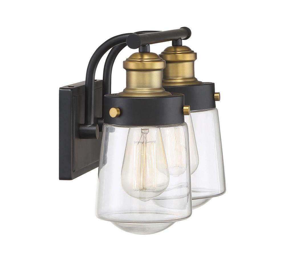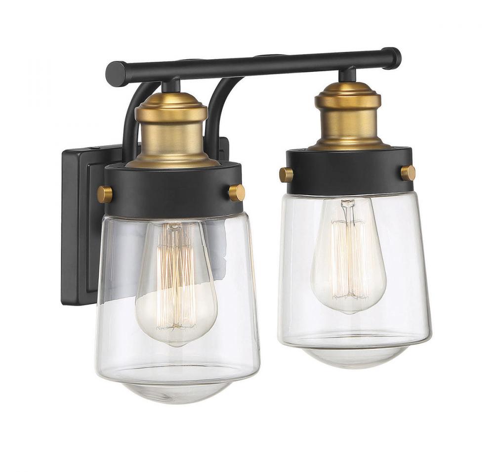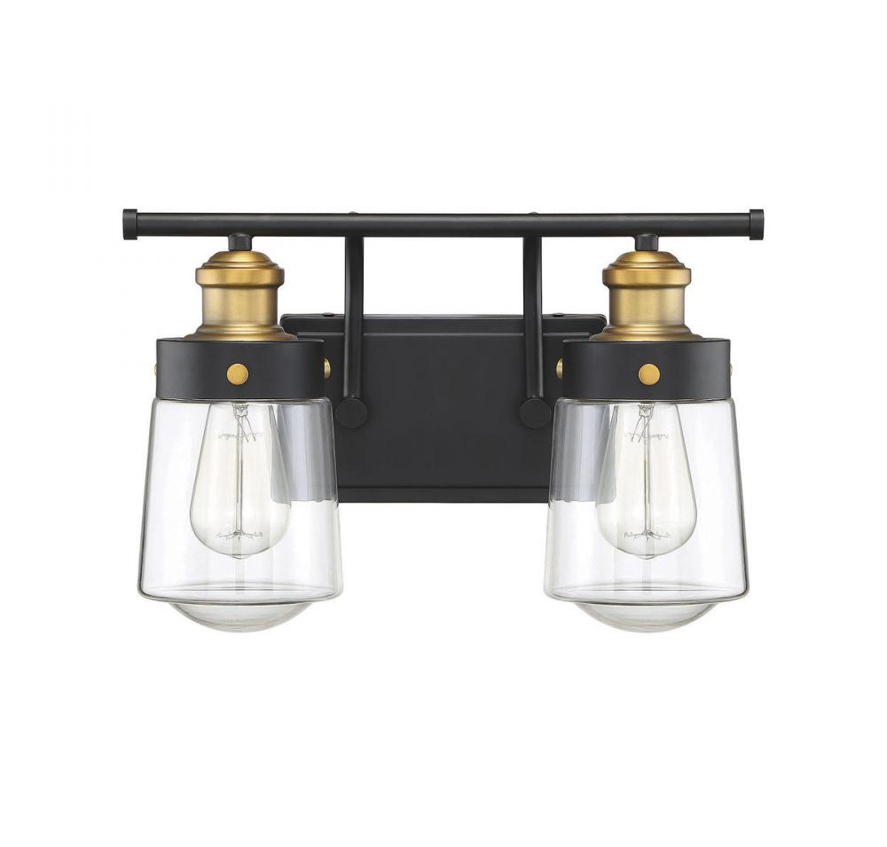 The ever-so-stylish, vintage-inspired look of the Macauley collection from Savoy House is now available as bath lights, including this 2-light bath bar. This fixture expertly combines schoolhouse-style molded glass shades, noticeable details like thumbscrews and the perfect pairing of black and brass to create a look that is sure to please. This fixture is 14.5" wide and 9.75" tall. It extends 6.75" from the wall. Uses 2 standard size bulbs of up to 60 watts each (not included).